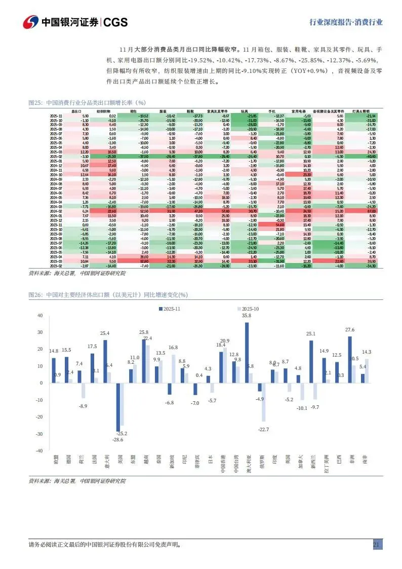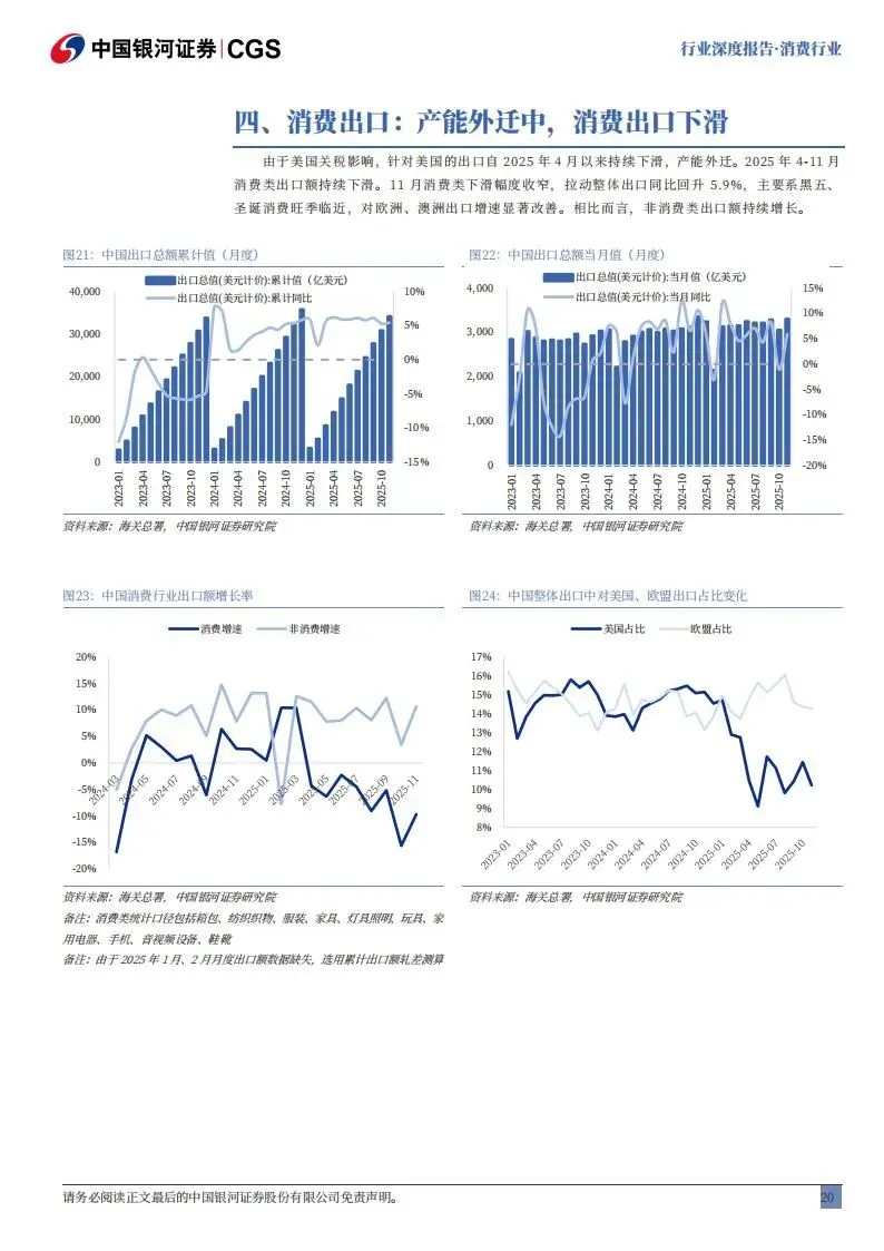 消费品出口方面,2025年延续下滑,产能向海外转移加快。随着补贴政策侧重内需,部分中国企业加快布局海外生产和渠道,适应国际市场需求变化。同时,国内消费品制造企业在新技术、新渠道和品牌提升方面加大投入,部分公司依靠创新产品和海外市场布局维持业绩稳定。