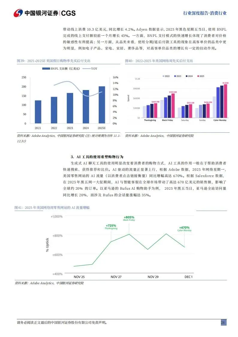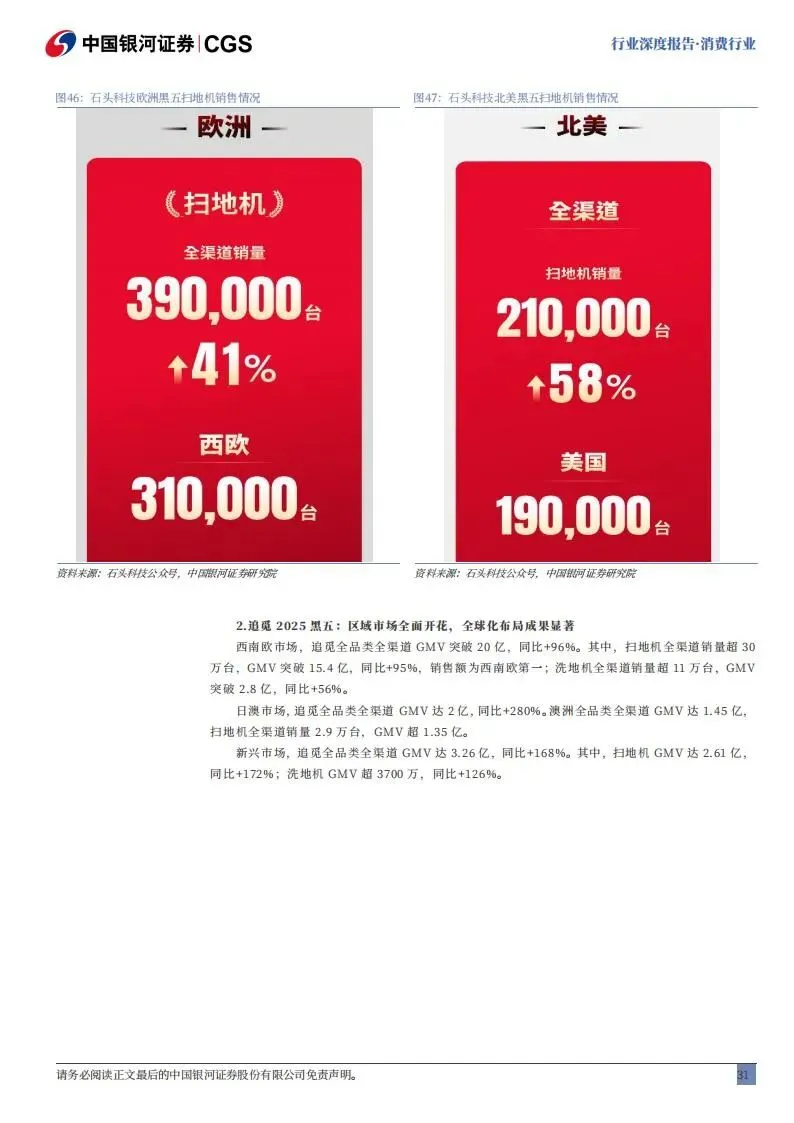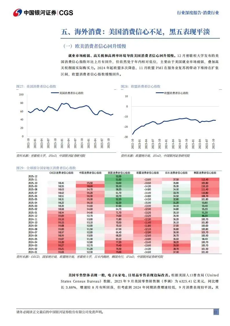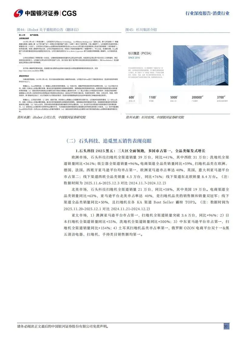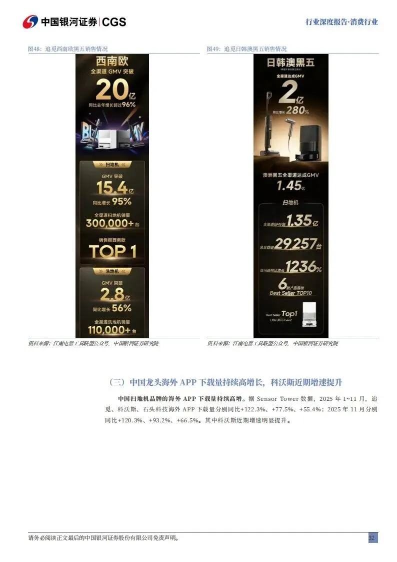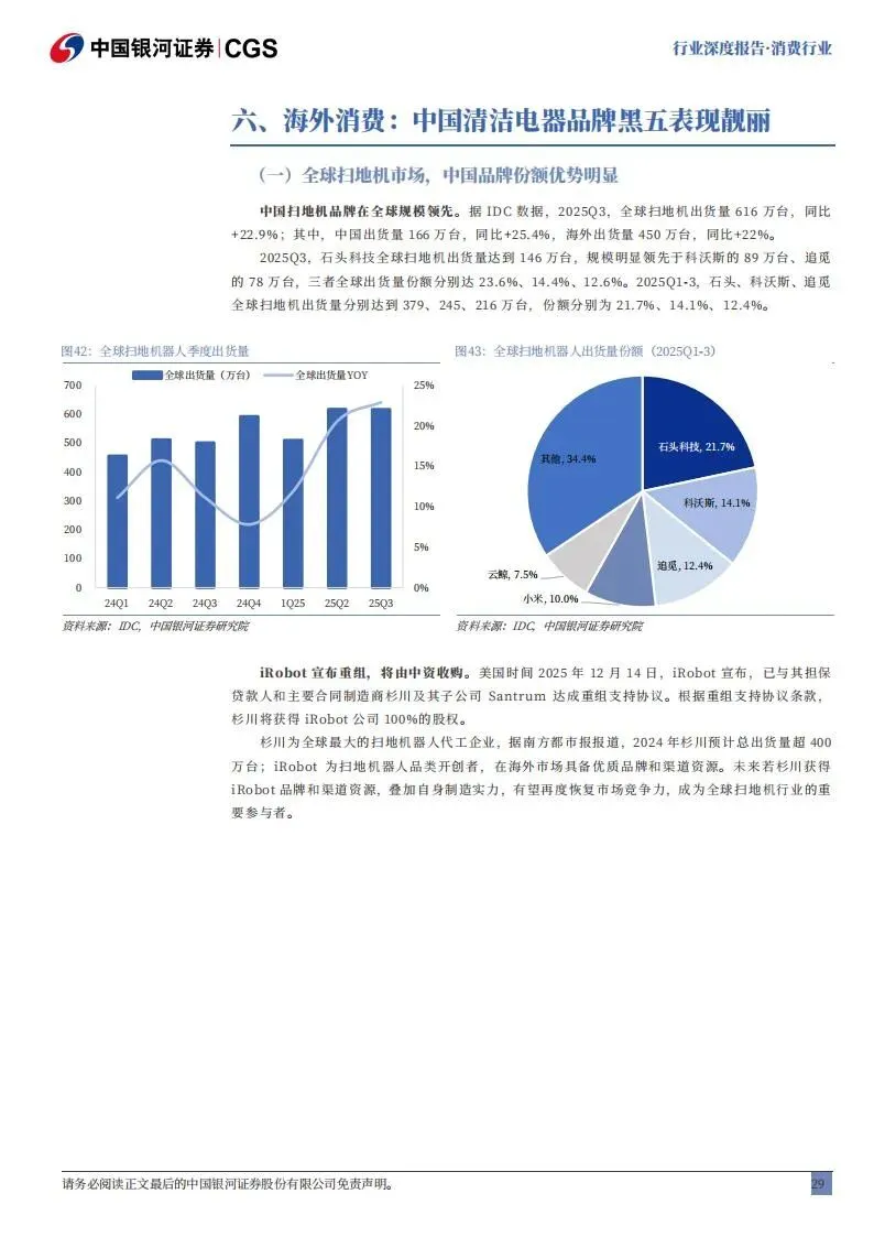 全球消费复苏进展缓慢,欧美高关税、高利率、就业低迷下,消费者信心不足。美国2025年12月密歇根大学消费者信心指数为53.3,远低于历史均值。黑色星期五促销期间,美国网络销售同比增长7.7%,但竞争极其激烈。中国品牌逆势突围,石头科技、追觅科技等清洁电器企业在海外黑五销售表现亮眼,品牌影响力持续提升。中国龙头企业在全球扫地机器人市场份额持续扩大,科沃斯APP海外下载量增长显著,国内科技消费企业逐步在国际市场取得突破。TCL电子H、海信家电、绿联科技等科技消费品牌也在国际市场表现出色。