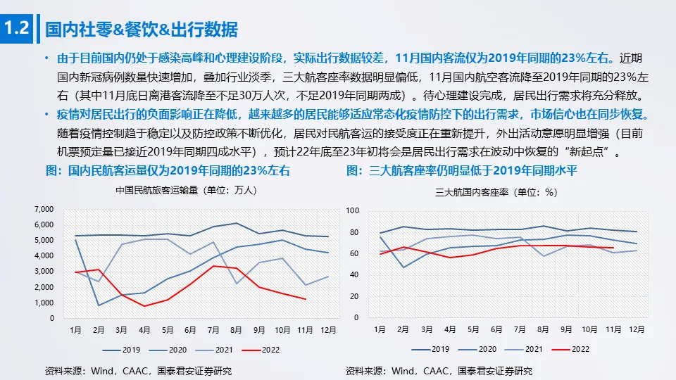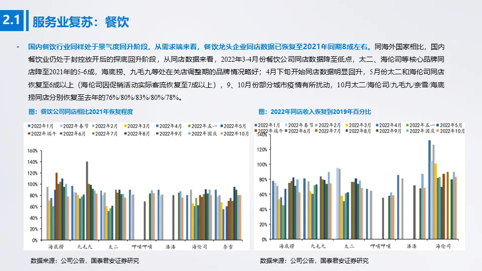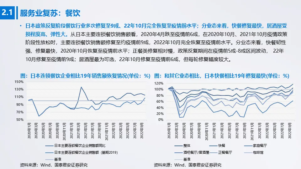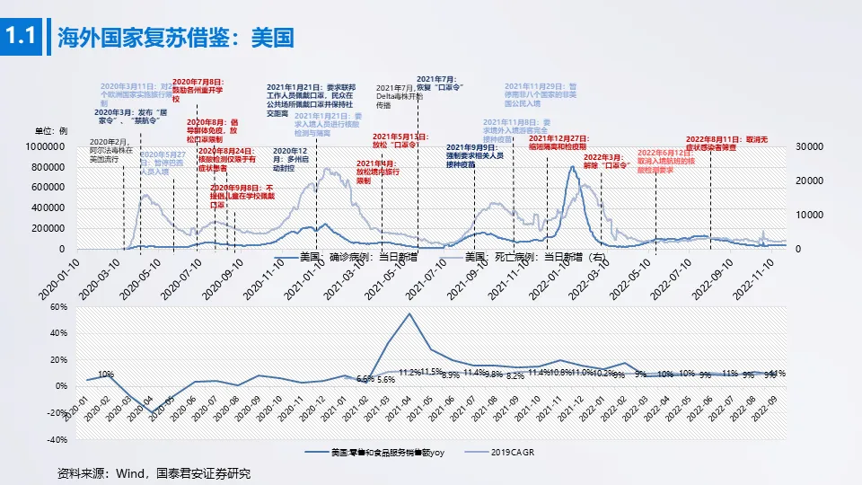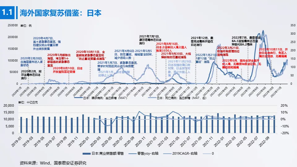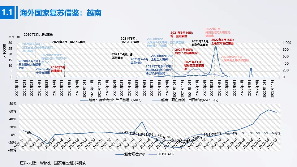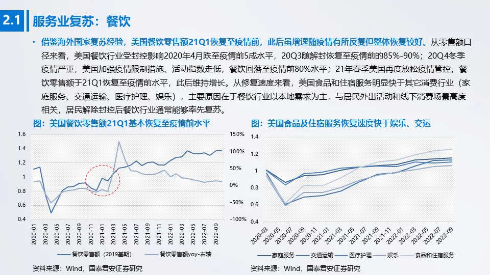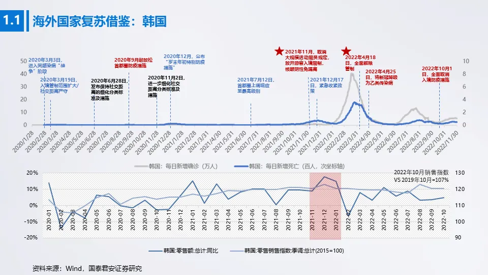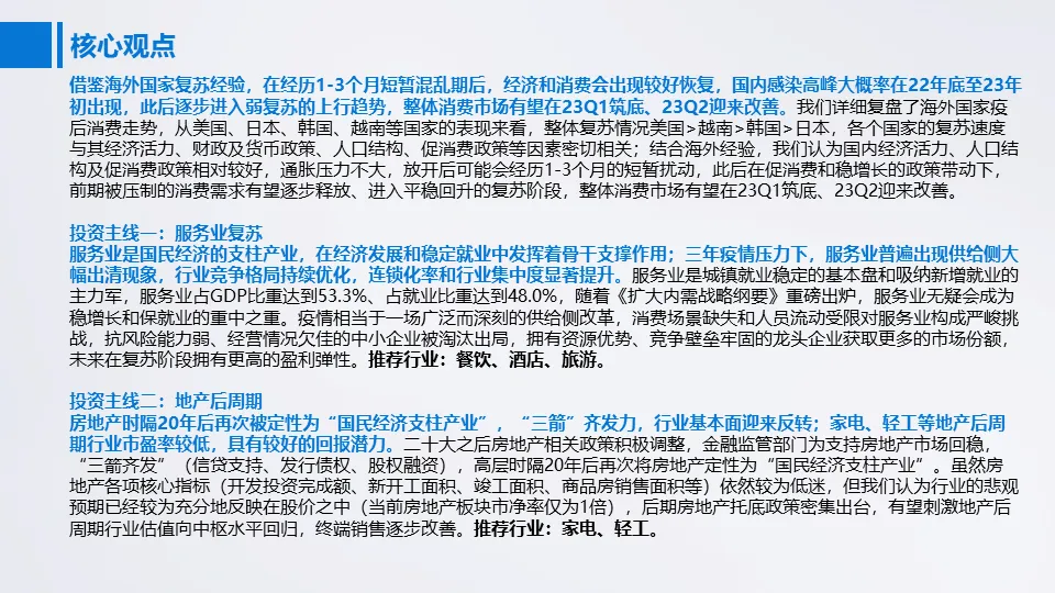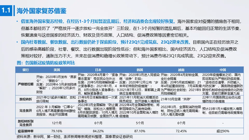 借鉴海外国家复苏经验,在经历1-3个月短暂混乱期后,经济和消费会出现较好恢复,国内感染高峰大概率在22年底至23年初出现,此后逐步进入弱复苏的上行趋势,整体消费市场有望在23Q1筑底、23Q2迎来改善。我们详细复盘了海外国家疫后消费走势,从美国、日本、韩国、越南等国家的表现来看,整体复苏情况美国>越南>韩国>日本,各个国家的复苏速度与其经济活力、财政及货币政策、人口结构、促消费政策等因素密切相关;结合海外经验,我们认为国内经济活力、人口结构及促消费政策相对较好,通胀压力不大,放开后可能会经历1-3个月的短暂扰动,此后在促消费和稳增长的政策带动下,前期被压制的消费需求有望逐步释放、进入平稳回升的复苏阶段,整体消费市场有望在23Q1筑底、23Q2迎来改善。