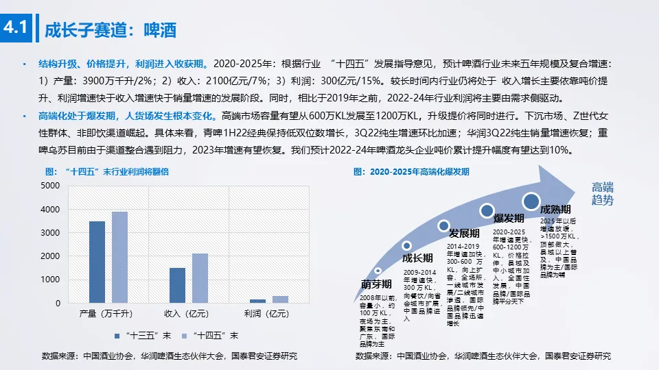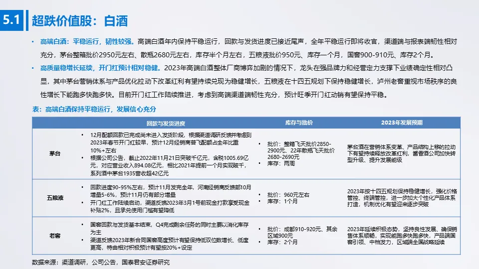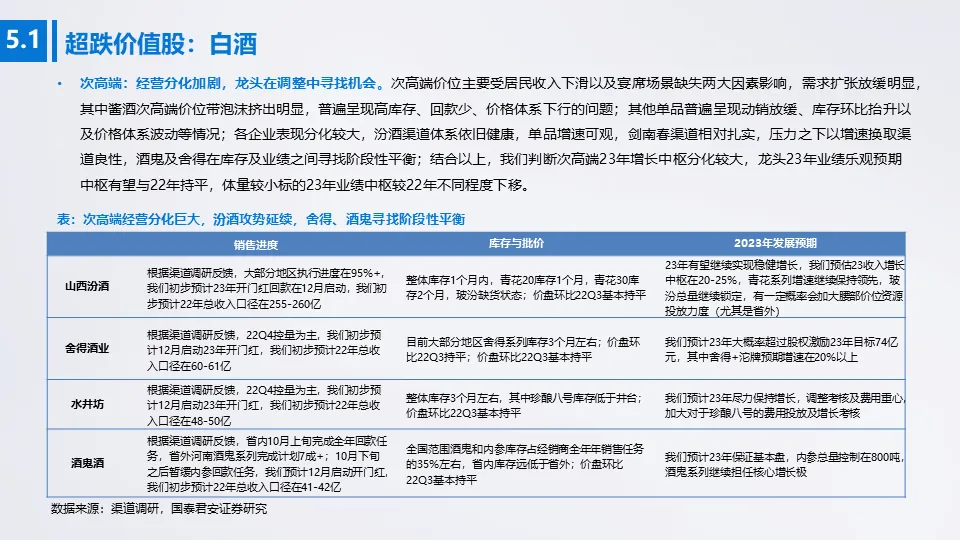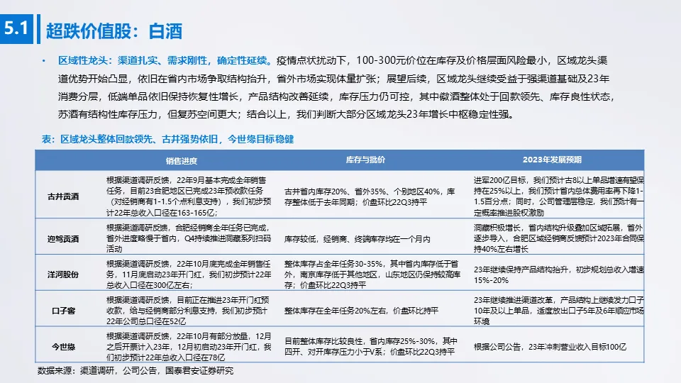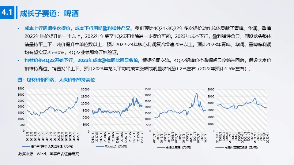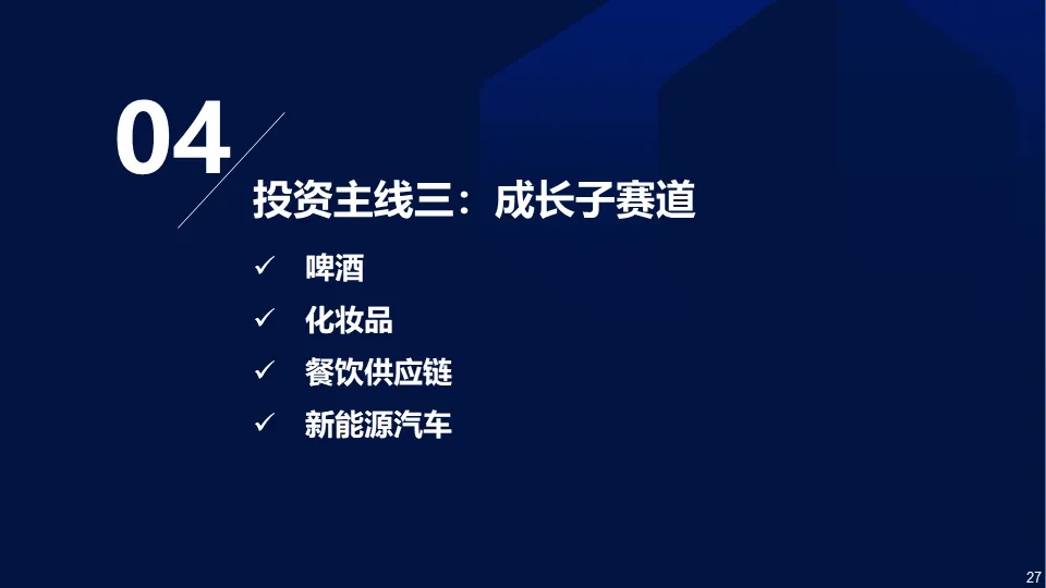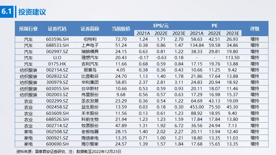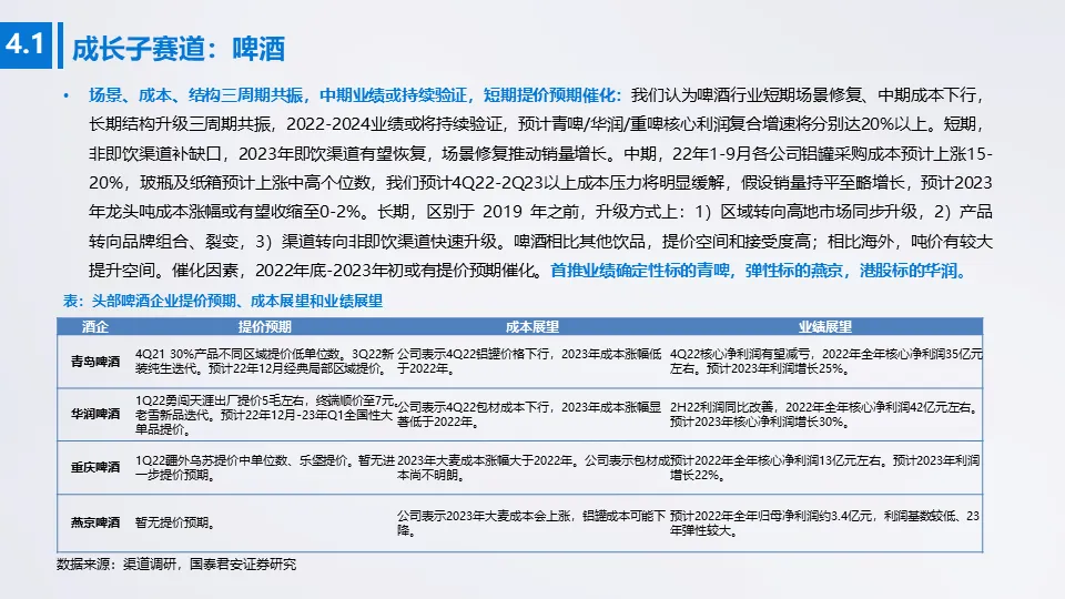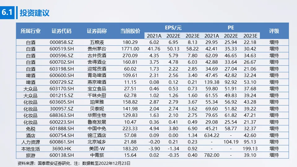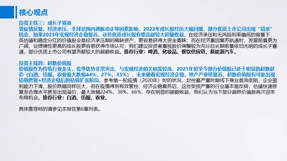 受疫情反复、经济承压、全球范围内通胀高企等因素影响,2022年成长股经历大幅回撤,部分优质上市公司出现“错杀”机会,如果2023年宏观经济企稳复苏,这些优质成长股有望贡献较大超额收益。在经济承压和无风险利率偏低的背景下,低估值和稳定分红的价值股会是经济承压期的稀缺资产,更容易获得大资金青睐;而在经济重回复苏轨道时,发展前景更为广阔、业绩弹性更高的成长股更容易获得市场认可;我们建议投资者重视股价调整较为充分且长期前景依旧光明的成长子赛道,部分优质上市公司有望贡献较大的超额收益。推荐行业:啤酒、化妆品、餐饮供应链、新能源汽车。