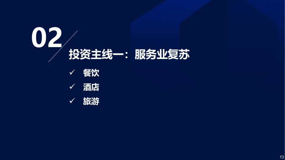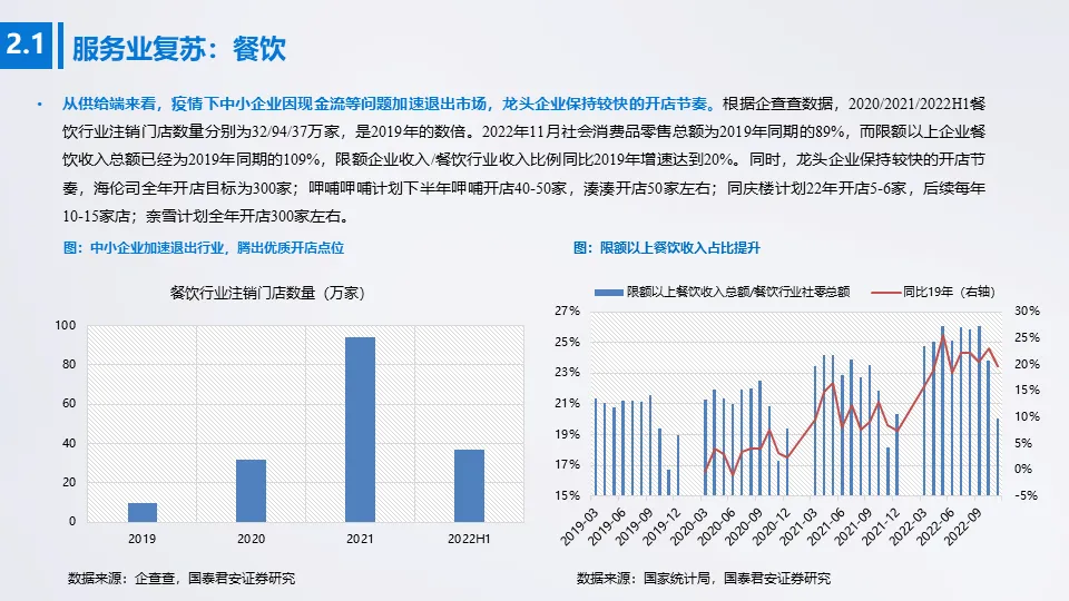 服务业是国民经济的支柱产业,在经济发展和稳定就业中发挥着骨干支撑作用;三年疫情压力下,服务业普遍出现供给侧大幅出清现象,行业竞争格局持续优化,连锁化率和行业集中度显著提升。服务业是城镇就业稳定的基本盘和吸纳新增就业的主力军,服务业占GDP比重达到53.3%、占就业比重达到48.0%,随着《扩大内需战略纲要》重磅出炉,服务业无疑会成为稳增长和保就业的重中之重。疫情相当于一场广泛而深刻的供给侧改革,消费场景缺失和人员流动受限对服务业构成严峻挑战,抗风险能力弱、经营情况欠佳的中小企业被淘汰出局,拥有资源优势、竞争壁垒牢固的龙头企业获取更多的市场份额,未来在复苏阶段拥有更高的盈利弹性。推荐行业:餐饮、酒店、旅游。