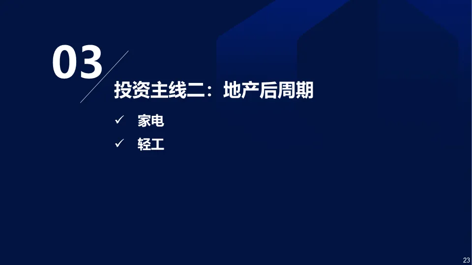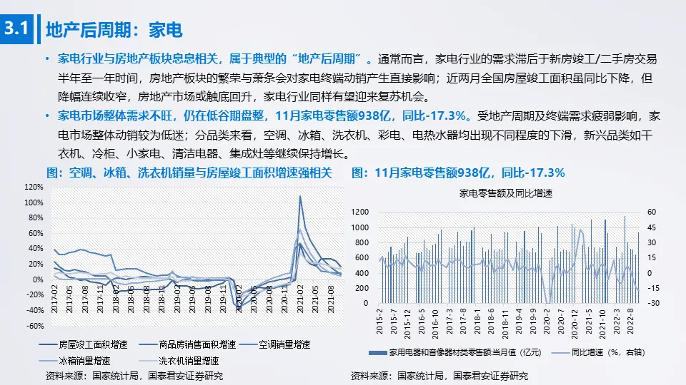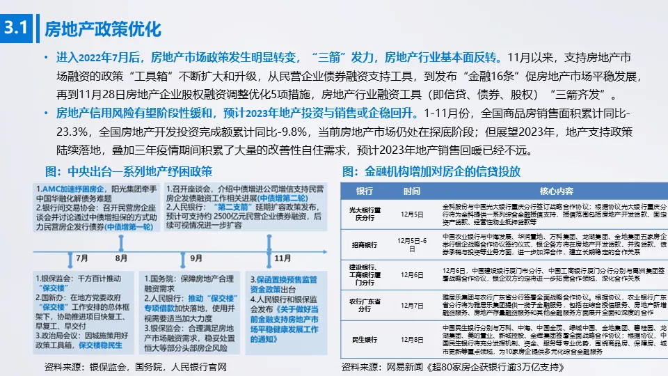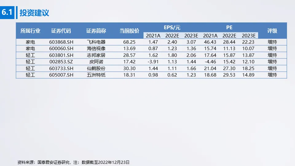 房地产时隔20年后再次被定性为“国民经济支柱产业”,“三箭”齐发力,行业基本面迎来反转;家电、轻工等地产后周期行业市盈率较低,具有较好的回报潜力。二十大之后房地产相关政策积极调整,金融监管部门为支持房地产市场回稳,“三箭齐发”(信贷支持、发行债权、股权融资),高层时隔20年后再次将房地产定性为“国民经济支柱产业”。虽然房地产各项核心指标(开发投资完成额、新开工面积、竣工面积、商品房销售面积等)依然较为低迷,但我们认为行业的悲观预期已经较为充分地反映在股价之中(当前房地产板块市净率仅为1倍),后期房地产托底政策密集出台,有望刺激地产后周期行业估值向中枢水平回归,终端销售逐步改善。推荐行业:家电、轻工。