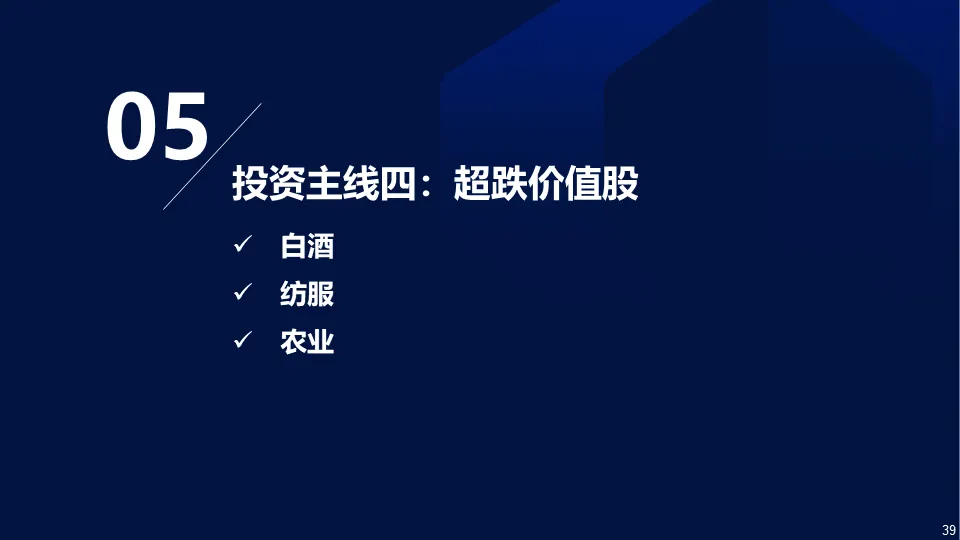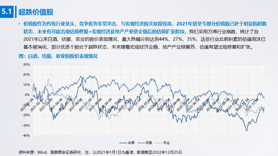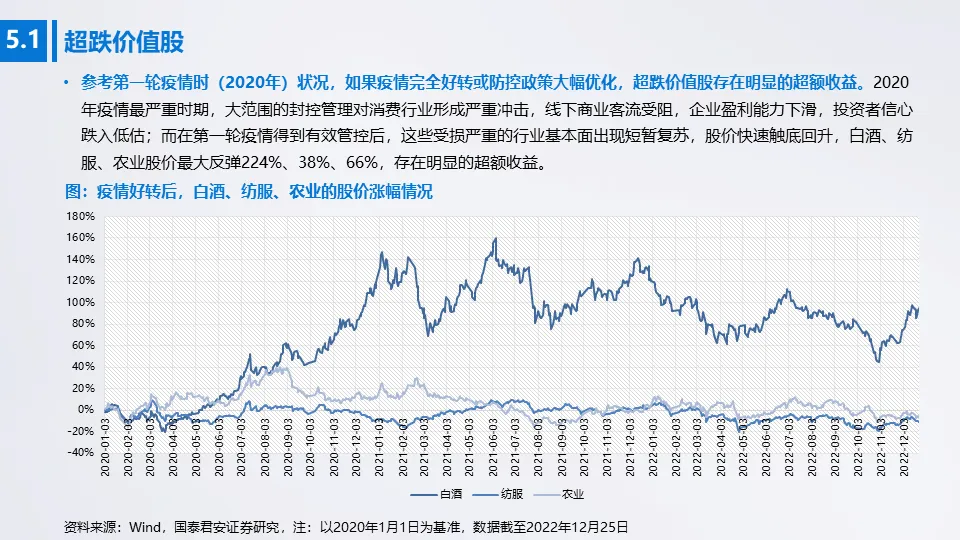 价值股作为传统行业龙头,竞争优势非常突出,与宏观经济的关联度较高,2021年初至今部分价值股已处于明显的超跌状态(白酒、纺服、农业最大跌幅44%、27%、35%),未来随着宏观经济企稳、地产产业链复苏,超跌价值股有可能出现估值修复+经济企稳后的估值扩张阶段。参考第一轮疫情(2020年)时的状况,封控最严重时期线下商业客流受阻、企业盈利能力下滑、股价跌幅同样巨大,但在疫情得到有效管控、经济企稳复苏后,这些受损严重的行业基本面反转,估值快速修复至合理水平甚至出现溢价,最大涨幅224%、38%、66%,存在明显的超额收益,我们认为当下部分超跌价值股再次迎来布局机会。推荐行业:白酒、纺服、农业。