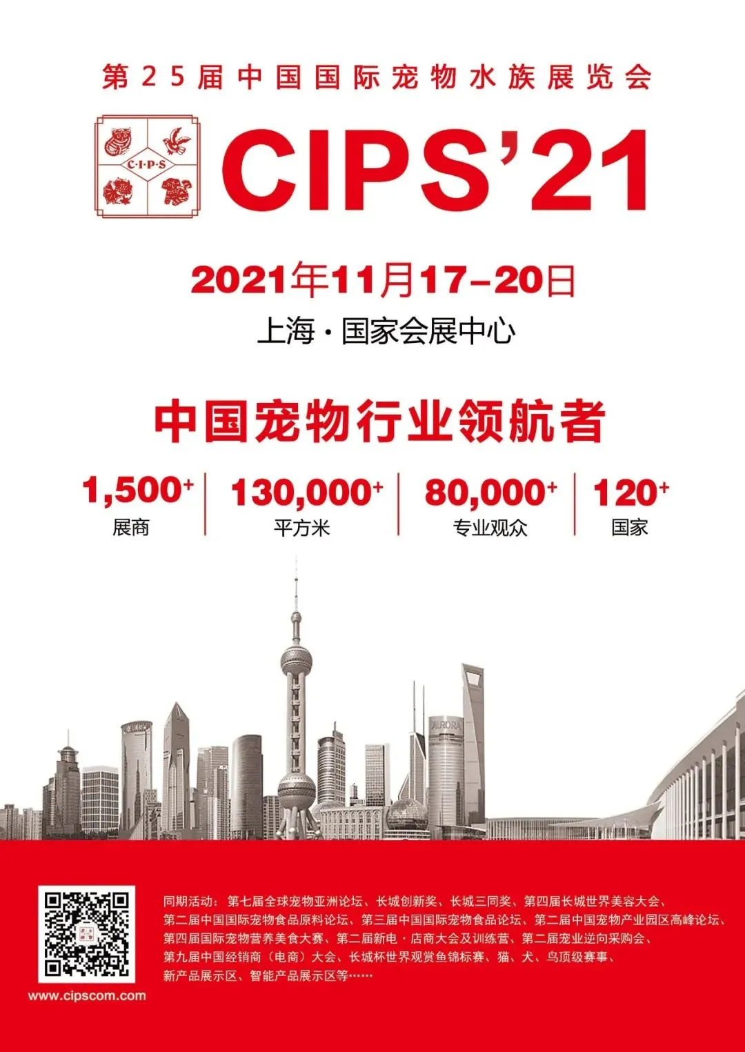 第25届中国国际宠物水族展览会(CIPS 2021)将于2021年11月17-20日,在上海·国家会展中心举办。展位预定现已开启,欢迎扫描下方二维码报名预定。