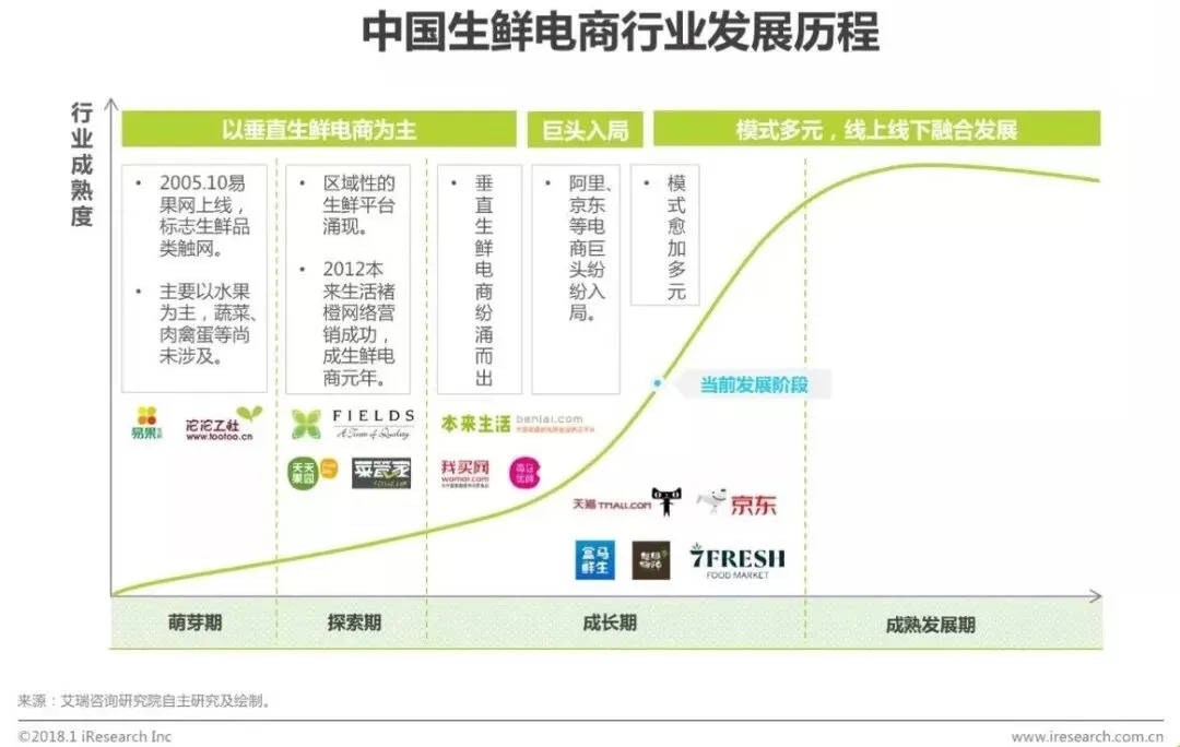 1. 中国生鲜电商行业历经探索、高速发展、洗牌,进入后成长期转型升级阶段。