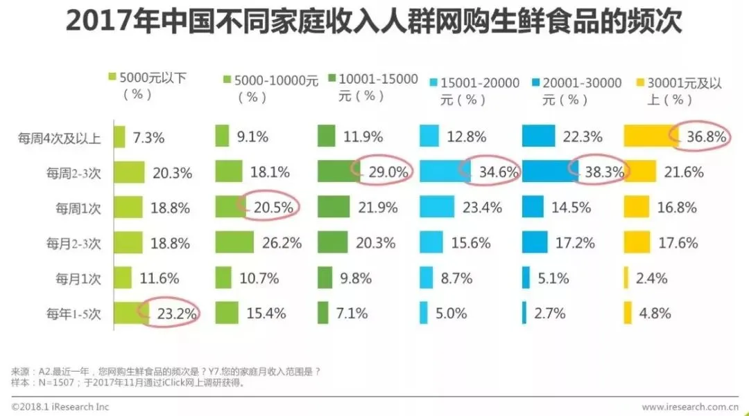 家庭月收入越高,网购生鲜食品的频次越高