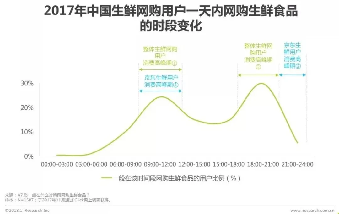 从消费时间来看,生鲜网购用户购物的活跃曲线在09:00-12:00和18:00-21:00出现波峰,这两个时间段分别对应午餐前和晚餐前的使用时段,用户可能选择这两个时间段网购午餐和晚餐所需要的食材。京东生鲜用户消费的第一段高峰期和整体用户基本一致,第二段高峰期时间为晚间21:00-22:00,相对靠后。艾瑞分析认为,京东生鲜B2C模式目前主要为次日达,用户在平台购买即时性晚餐食材的需求较小。
