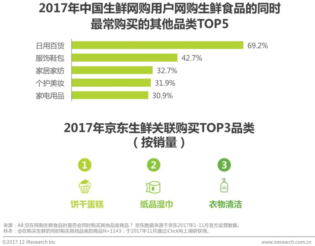 生鲜食品引流作用明显,75.9%的用户表示在购买生鲜食品的同时会购买其他品类的商品。其中日用百货等高频需求是用户在购买生鲜食品时最常购买的品类,有69.2%的用户会在购买生鲜食品的同时购买日用百货。京东销量数据显示,网购生鲜食品时关联购买的TOP3品类为饼干蛋糕、纸品湿巾、衣物清洁,也是以零食及日用品为主。