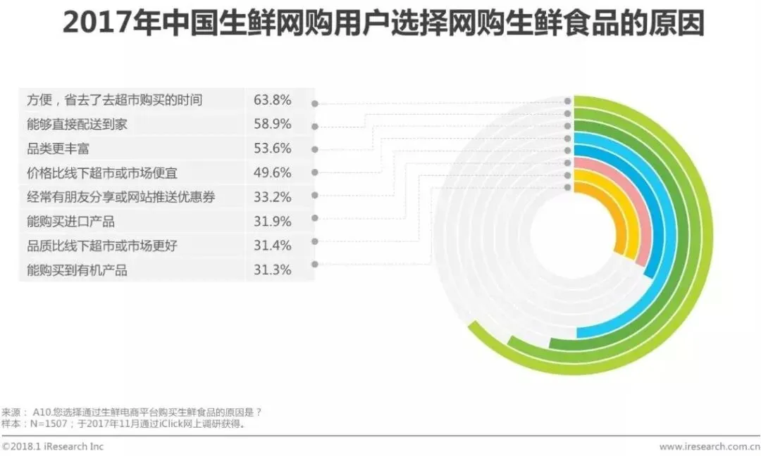 调研数据显示,用户选择网购生鲜食品最主要的原因是方便,选择比例为63.8%。能够直接配送到家和品类丰富也是用户选择网购生鲜食品的重要原因,选择比例分别为58.9%和53.6%。
