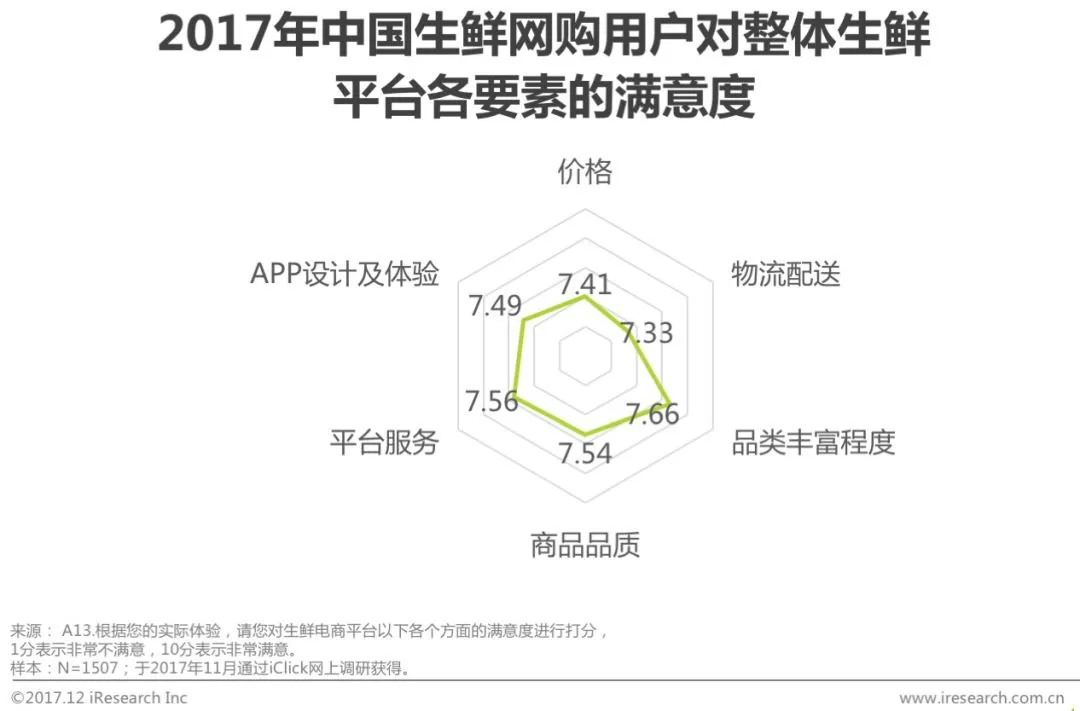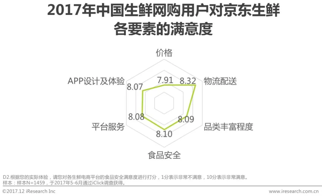 艾瑞调研数据显示,生鲜网购用户对整体生鲜网购各个要素的满意度均在7分以上,对品类丰富程度的满意度最高,平均分为7.66分。从京东生鲜与行业整体对比来看,其各个细分维度的满意度均高于行业整体,物流配送方面的优势最为明显:行业整体物流配送方面的评分较低,为7.33分;京东生鲜的物流得分则高达8.32分。