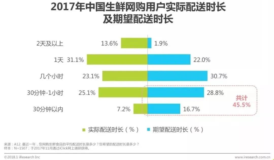 45.5%的用户希望配送时长在1小时内