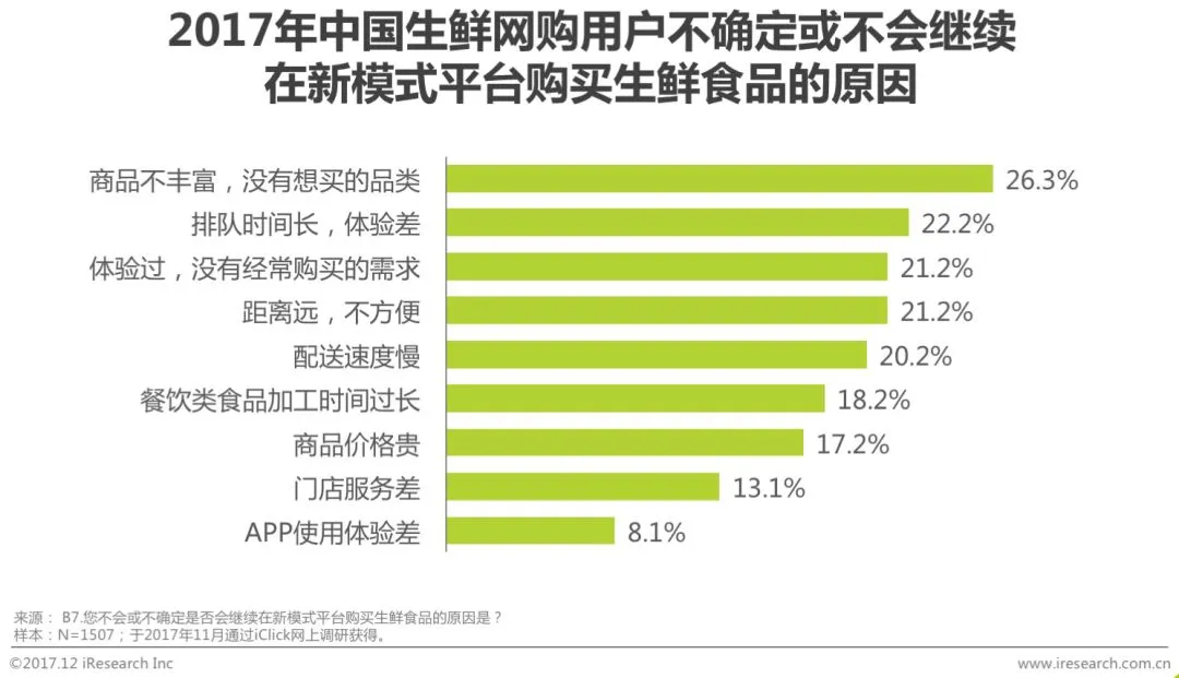 超过九成的用户表示将继续在创新模式平台购买生鲜食品。用户不确定或不会继续购买的主要原因为商品品类不够丰富;其次,客流量较大导致门店排队时间长带来的不便体验也是导致用户不愿意继续在创新模式平台消费的重要原因。