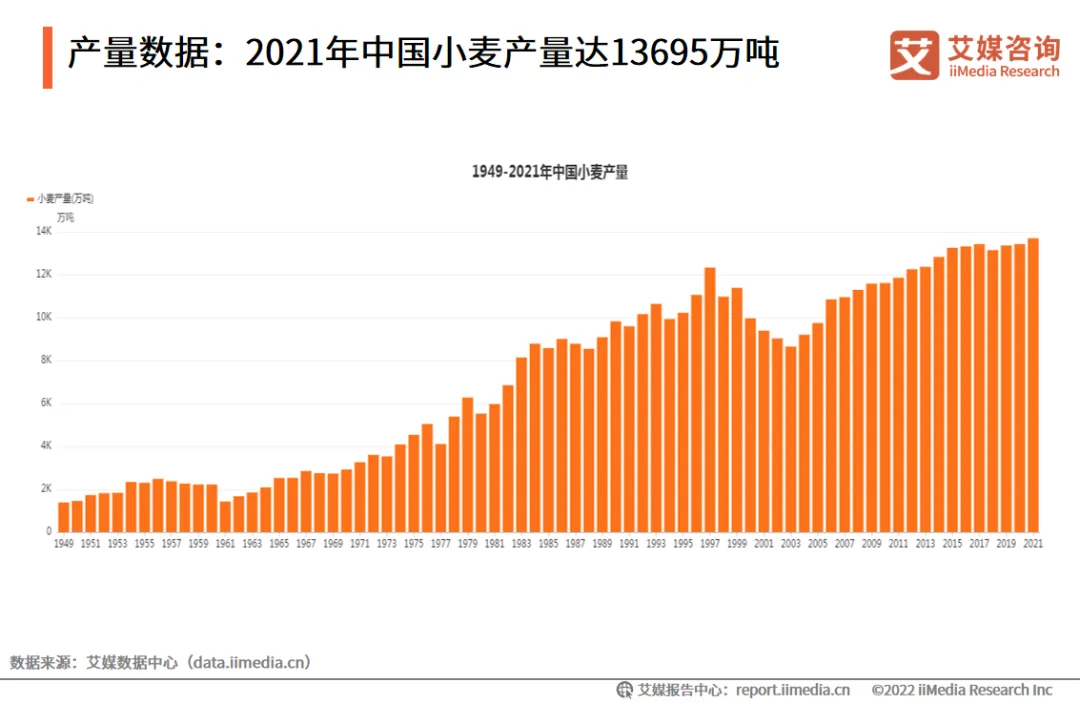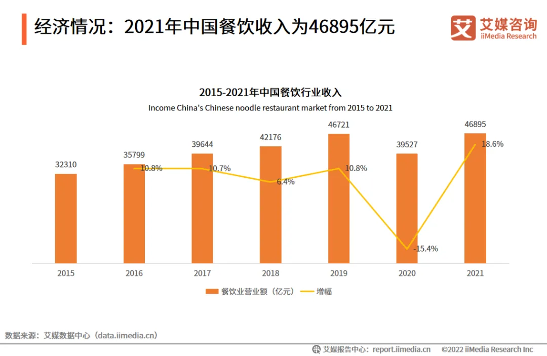 艾媒咨询分析师认为,近年来,面馆行业转向中高端方向发展,新兴品牌获得市场和资本的青睐,而且中式面馆门槛较低、流程复制率较高,市场竞争激烈。为增加市场份额,面馆企业应不断在品牌形象、营销方式、衍生零售产品等方面进行创新。市场规模:预计2022年中国中式面馆市场规模突破3400亿元数据显示,2021年中国中式面馆市场规模为3120.9亿元,预计2022年突破3400亿元。艾媒咨询分析师认为,随着餐饮业的发展,面馆行业进行了新一轮革新。在消费升级、食品口味和样式多元化的带动下,中式面馆行业将高速发展。用户调研:面食消费者价格接受度较低,影响消费者选择的主要因素是味道和口碑iiMedia Research(艾媒咨询)调研数据显示,50.4%的受访者偏好面条,其中,受访者对炸酱面的喜爱度最高;37.0%的受访者能接受的面食价格是16-30元。可见,味道和口碑是影响受访者选择中式面馆的重要因素,占比均超过60.0%。近年来,面馆行业转向中高端方向发展,新兴品牌获得市场和资本的青睐,而且中式面馆门槛较低、流程复制率较高,市场竞争激烈。为增加市场份额,面馆企业应不断在品牌形象、营销方式、衍生零售产品等方面进行创新。随着消费者的食品需求多样化,中国中式面馆进入品牌化的发展阶段,面馆企业现处于以面为主要产品的面馆升级阶段。目前,中国面食产品的分类主要按地域、品类以及做法进行划分。随着种植手段的进步和小麦育种技术的提升,小麦产量保持稳定增长的态势。数据显示,2021年小麦产量达13695万吨,同比2020年增长2.01%。小麦产量的稳定增长为中式面馆的可持续发展提供强有力的保障。数据显示,受疫情影响,2020年中国餐饮行业收入下降,2021年中国餐饮收入为46895亿元,较去年增长18.6%。