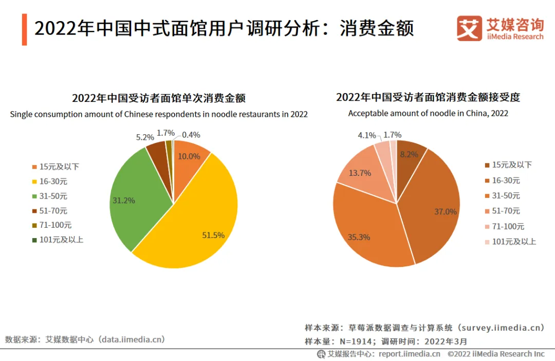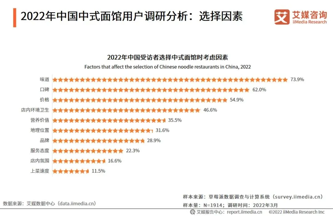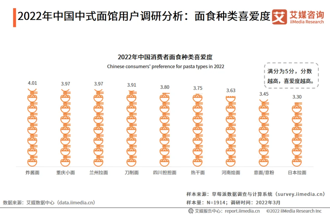 艾媒咨询分析师认为,随着人们可支配收入和消费水平的逐步提高,未来,人们在餐饮上的支出将会逐年提升,将有利于中式面馆行业的发展。市场规模:预计2022年中国中式面馆市场规模突破3400亿元数据显示,2021年中国中式面馆市场规模为3120.9亿元,预计2022年突破3400亿元。艾媒咨询分析师认为,随着餐饮业的发展,中式面馆行业进行了新一轮革新。在消费升级以及食品口味和样式多元化的带动下,中式面馆行业将高速发展。中国中式面馆大部分以快餐业态为主,细分品类多,通常打造地域特色面食。面馆企业运营主要是连锁化经营。数据显示,五爷拌面的门店数量较多,主要分布在东北三省,依托直营和加盟双模式在全国拓店,而西贝筱面村的门店主要集中在一线城市。iiMedia Research(艾媒咨询)调研数据显示,超过五成的受访用户喜欢的餐食是面条。从不同区域受访者的吃面频率看,华中、华北、东北地区有超三成受访者每天都会吃面,而华南地区的受访者中,仅有18.5%的消费者会以面条为主食。不同地域消费者的饮食习惯差异较大。2022年中国中式面馆用户调研分析:面食种类喜爱度iiMedia Research(艾媒咨询)研数据显示,在面食种类中,消费者对中式面条的喜爱程度较高。其中,炸酱面的喜爱度最高,为4.01分。而受访者对意面/意粉和日本拉面的喜爱程度较低,分别得分3.45和3.30。艾媒咨询分析师认为,中式面食受欢迎程度较高,表明中式面馆仍有很大的发展空间。iiMedia Research(艾媒咨询)调研数据显示,51.5%的受访者单次面食消费金额为16-30元。超过八成受访者能接受的单次面馆消费金额在50元以内,其中,16-30元的占比为37.0%。这说明消费者实际单次面馆消费金额和期望的单次面馆消费金额一致。消费者对价格高的面食接受度较低,大众化定价策略有利于中式面馆增强用户粘性。iiMedia Research(艾媒咨询)调研数据显示, 66.7%的受访者仅接受30分钟以内的路程,30.8%的受访者能够接受半小时左右的面馆等座,81.8%的受访者选择外卖的方式购买面条。面条的烹饪和食用时间较短,消费者更倾向于选择时间成本较低的方式去购买面食。iiMedia Research(艾媒咨询)调研数据显示,受访者在选择中式面馆时,会关注味道、口碑以及价格,分别占比73.9%、62.0%及54.9%。艾媒咨询分析师认为,消费者在选择面馆时更加关注面条的品质和口感,品牌效应对面馆选择的影响较小。近年来,面馆行业转向中高端方向发展,新兴面馆品牌获得市场和资本的青睐,五爷拌面、和府捞面、遇见小面、瓷面江湖等诸多品牌已获得融资。而且中式面馆入门门槛较低、流程复制率较高,市场竞争激烈。为扩大市场份额,中式面馆企业应在口味、口碑和价格等因素中迅速吸引消费者。传统中式面馆的收入来源较单一,为提高面馆品牌的知名度,中式面馆应不断在品牌形象、营销方式、衍生零售产品等方面进行创新。完善的商业模式能够帮助面馆企业进行稳定经营,丰富企业的收入渠道,从而提高面馆企业的市场竞争力。欢迎在评论区写留言,与我们互动讨论!