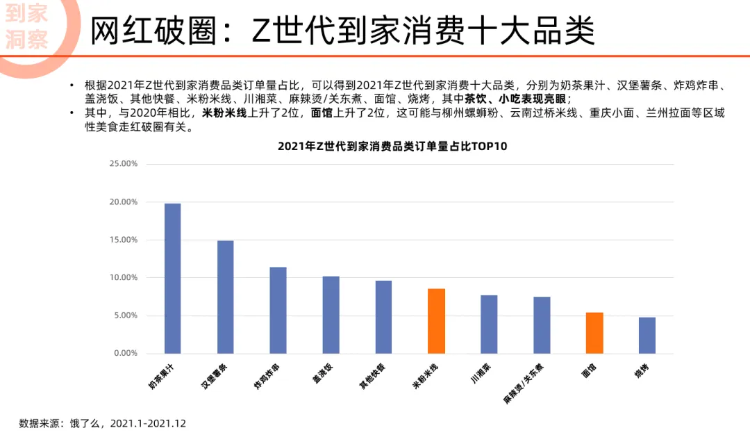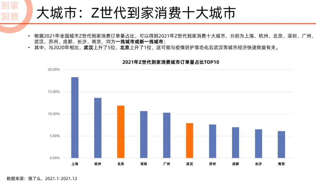 在到家消费方面,报告公布了面向未来的到家消费十大城市、十大品类以及主要品类品牌榜。报告显示,面向未来,一线及新一线城市到家消费遥遥领先。2021年,上海、杭州、北京、深圳、广州、武汉、苏州、成都、长沙、南京年轻人到家消费位居前十;与2020年相比,武汉上升了5位,北京上升了1位。