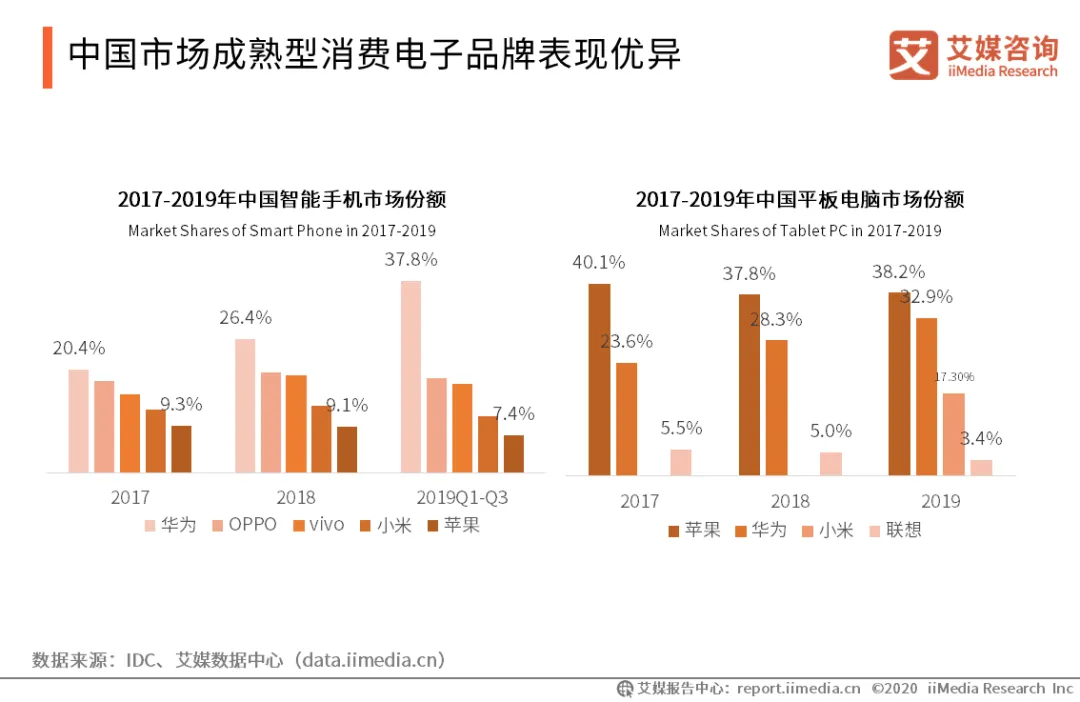 消费电子产品是指供日常消费者生活使用的智能电子硬件产品,包括数码设备、学习硬件和可穿戴设备。不同的产品行业发展形态差别较大,可以分为以智能手机、平板电脑为代表的成熟型产品,和以翻译笔、可穿戴设备为代表的成长型产品。对于发展较为成熟的智能硬件产品,中国品牌企业在研发实力和产品体验上均具有强大竞争力,在市场表现优秀。数据显示,智能手机市场上,华为、小米、OPPO、vivo在中国市场上连续3年入围份额前五。平板电脑市场上,华为也稳居第二,并不断缩小与苹果之间的差距。
