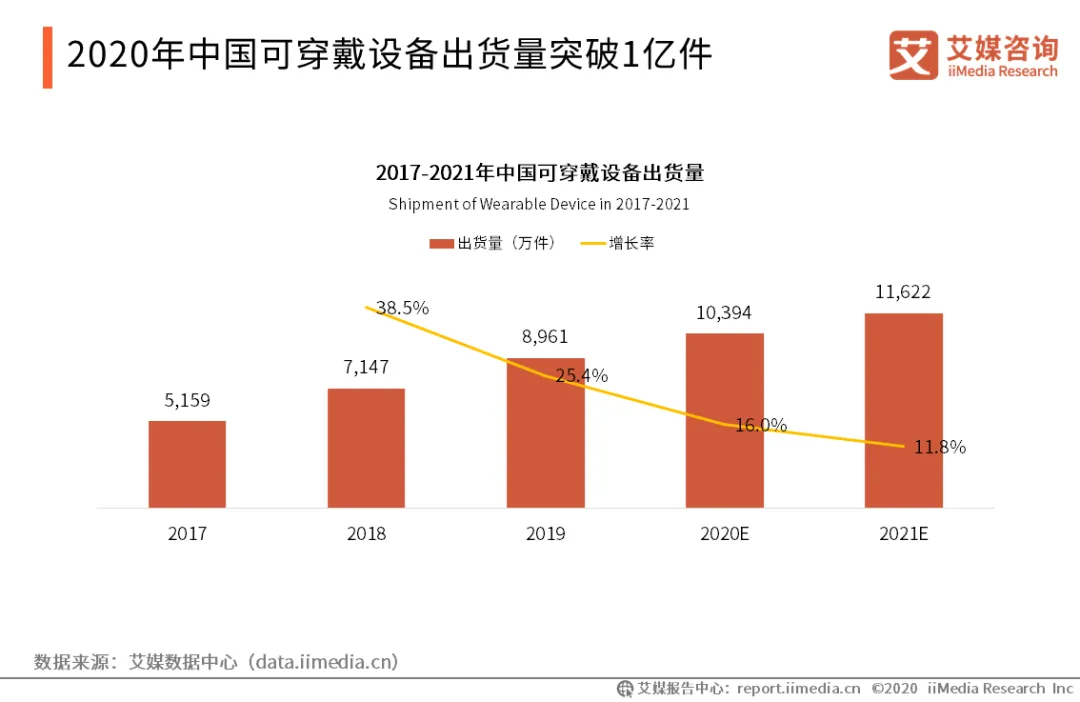 成长型产品方面,作为智能硬件成长型产业代表产品,可穿戴设备市场逐年扩大,但增长速度较为平缓。艾媒咨询数据显示,中国可穿戴设备出货量逐年增加,2019年达8961万件,预计2020年将突破1亿件。在未出现技术突破的情况下,可穿戴设备仍将主要应用于娱乐及体感监测领域。