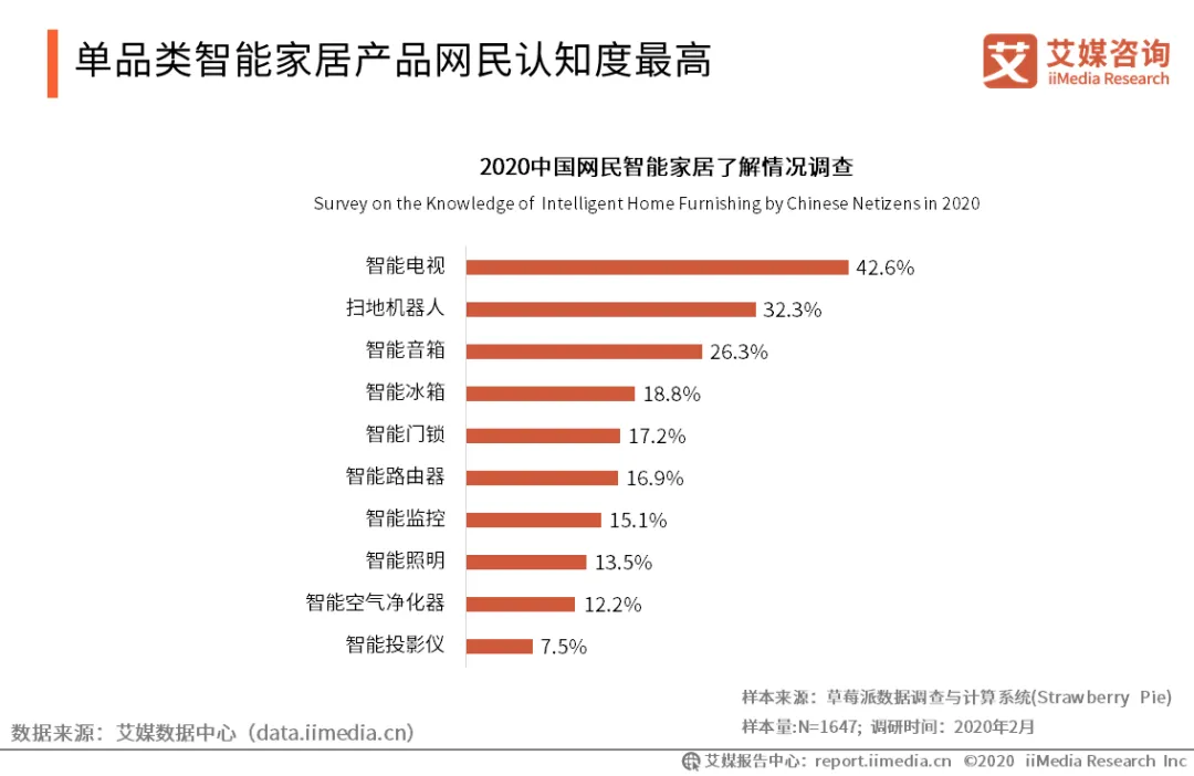 艾媒咨询分析师认为,不同品类智能家居产品市场特点差异较大,单品类产品由于直接面向消费者,且以家电为主,覆盖消费者日常消费刚需,受认知程度较高。