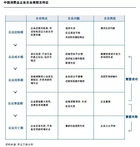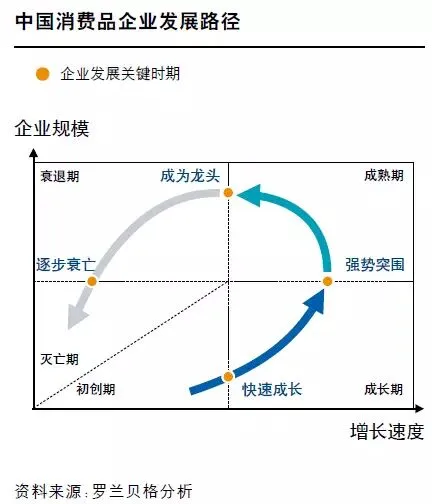 罗兰贝格报告认为,根据企业规模和增速划分,中国消费品企业生命周期呈现出鲜明的、极具规律性的运转轨迹,其间将经历始弱渐强、由胜而衰的五大发展阶段和四个关键转折点,罕有例外。