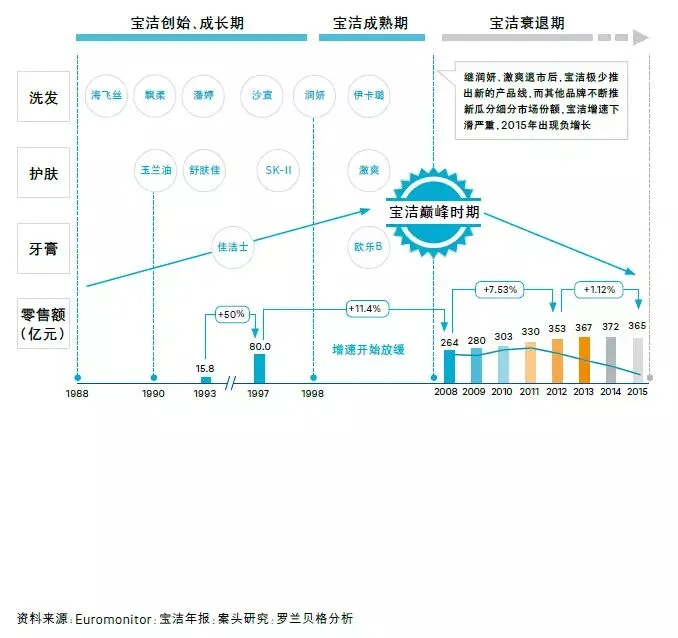 宝洁衰退期(2008年至今):战略误判,低估了中国中产阶层的消费能力,在中国消费者不断追求消费升级和消费个性化的过程中,始终坚持平价和大众化策略,致使原有中高端品牌的老化趋势明显,同时未能推出具有吸引力的新产品线。这使宝洁的市场份额在2008年之后不断缩水,渐渐失去行业头把交椅的王座。