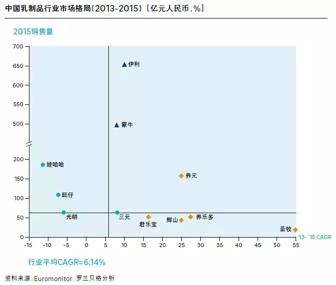 乳制品行业处于如日中天期:蒙牛及伊利作为行业龙头,凭借对上游优质养殖场的强大控制、广泛的渠道网点及强大的品牌优势,在常温奶领域建立起了强势的竞争护城河。区域类企业同样具有良好的发展态势,一定程度上向传统乳制品大佬发起挑战:养元清晰切准核桃健脑类乳饮品市场,打造“六个核桃”爆品;圣牧敏锐捕捉食品领域的“有机”趋势,发力有机高端白奶;养乐多凭借深厚的乳酸菌研发及先行者优势,成为中国低温乳酸菌行业的引领者;君乐宝凭借常温酸奶及常温乳酸菌饮料发力全国市场,正获得快速增长。