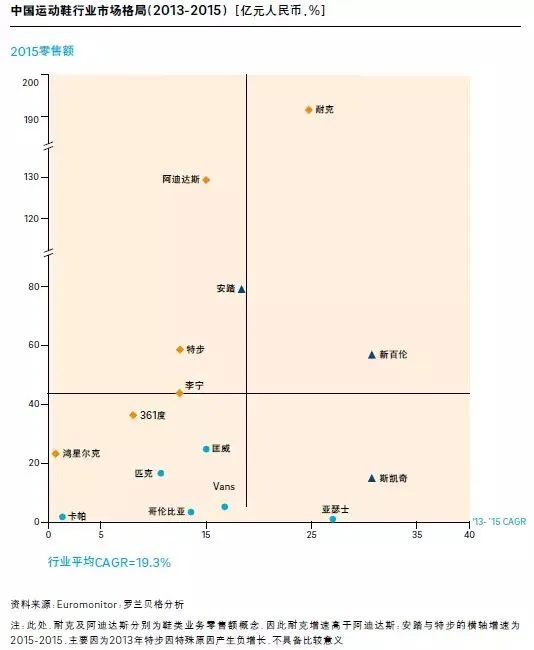 运动鞋行业市场处于危机酝酿期:耐克聚焦专业运动,阿迪达斯聚焦时尚休闲,品牌特色鲜明且研发实力强劲,龙头地位坚挺。但随着市场内消费人群价值需求细分,以新百伦、斯凯奇为代表的主打运动时尚诉求,以及以安踏为代表的主打低层级市场消费者诉求的品牌,均拥有自身鲜明、独特的市场定位,正对传统龙头发起挑战。而传统中国运动领导品牌李宁、361度及特步等,由于品牌定位日渐模糊、产品创新研发能力不足且渠道下沉,红利逐渐消失,面临增速低于行业平均的成长困境,市场份额渐被蚕食。
