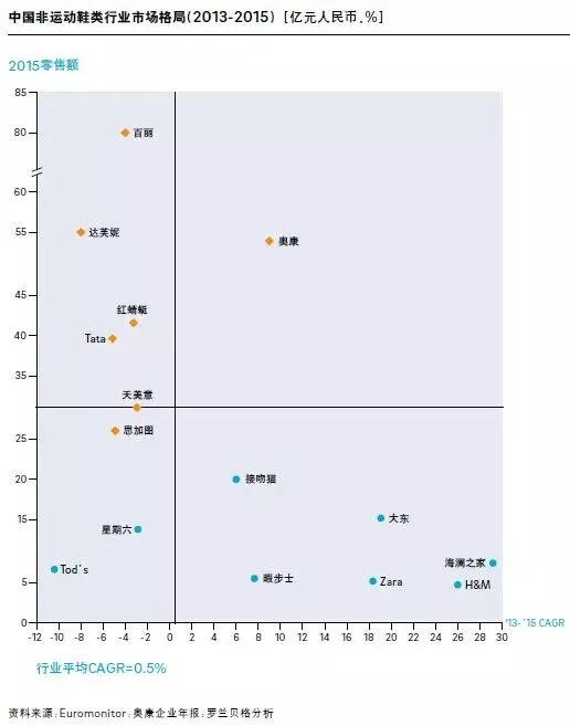 非运动鞋类行业市场处于如日中天期与危机酝酿期的交界点:受消费需求快速更迭及百货渠道日渐式微的影响,传统老牌女鞋企业纷纷面临重大下滑困境,短期内扭转困难。以大东为代表的低价革鞋品牌,以及以Zara和H&M为代表的快时尚跨界品牌正快速成长。男鞋代表品牌奥康近年来凭借街边店渠道优势,依托多品牌及大店改造策略,表现突出。