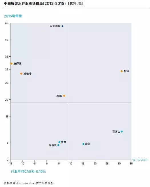 瓶装水行业处于白蚁噬象期:在新晋挑战者的冲击下,传统瓶装水龙头企业康师傅及娃哈哈节节败退,出现负增长。农夫山泉近年来以优质水源为核心卖点,提出的“自然的搬运工”理念获得极大成功。而怡宝及百岁山则抓准高端瓶装水细分的市场机遇,迅速切入,获得快速增长。