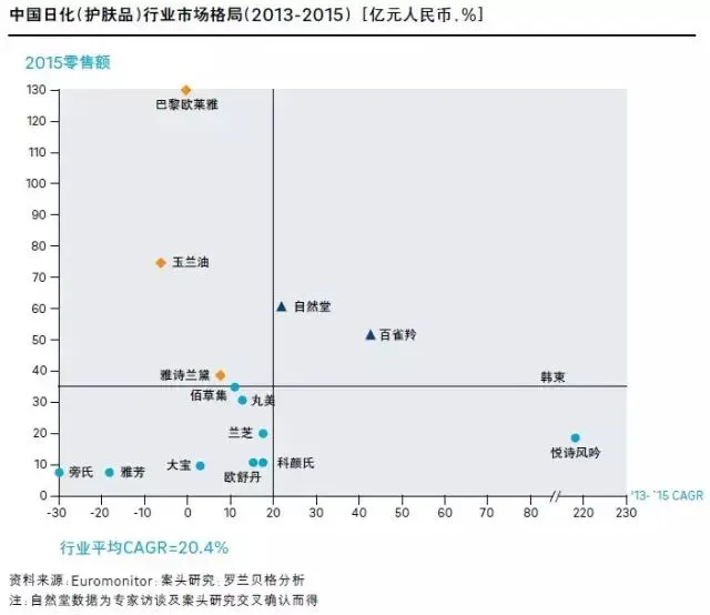 日化(护肤品)行业处于白蚁噬象期:由于品牌及产品定位固化,中国昔日护肤品牌霸主大宝未能因时而变,最终陨落。现有龙头巴黎欧莱雅、玉兰油等品牌在行业多元化发展过程中未能快速灵活应变,无法满足消费者日益细分的价值诉求,导致成长乏力,疲态已现。自然堂作为新兴本土品牌,专注于低层级市场消费者的价值诉求,依靠灵活的经销政策与贴合低层级消费者的促销方式,深耕化妆品专营店,实现了低层级市场的迅速扩张。韩束精准聚焦办公人群对皮肤干燥的差异需求痛点,以补水保湿概念迅速抢占细分市场。百雀羚近年来对品牌进行重新定位,回归天然草本的中国概念,赢得极大反响。自然堂、韩束及百雀羚正逐步侵蚀昔日霸主的市场份额,对王位发起冲击。