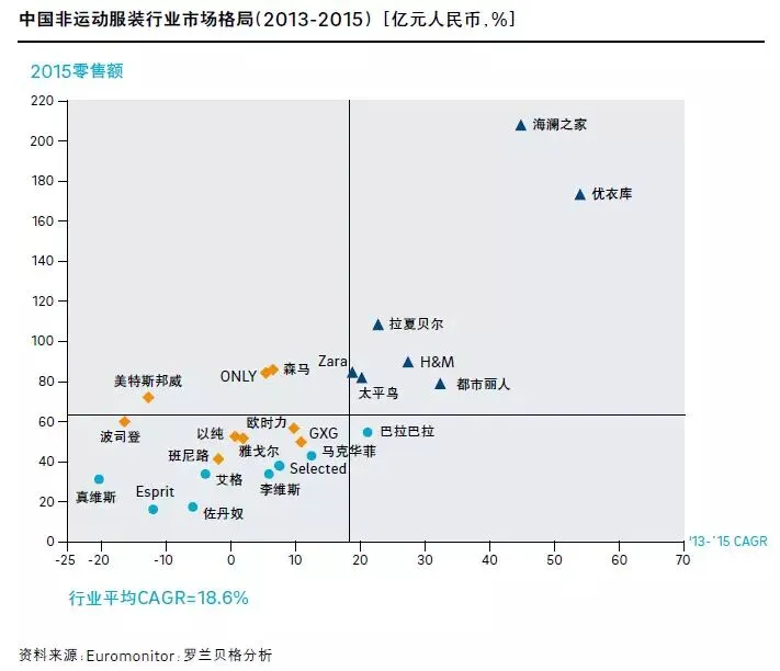 非运动服装市场处于白蚁噬象期:由于对时尚趋势把握不足、产品研发能力薄弱等问题,以美特斯邦威、波司登等为首的昔日龙头企业逐渐丢失快速变化的服装市场份额,被以Zara、H&M为代表的坚持以设计为核心并快速反应消费者需求变化的快时尚品牌,及以优衣库、海澜之家为代表的提供基本款但以高质面料、精湛工艺取胜的品牌所取代。