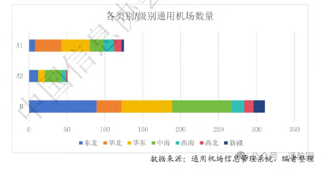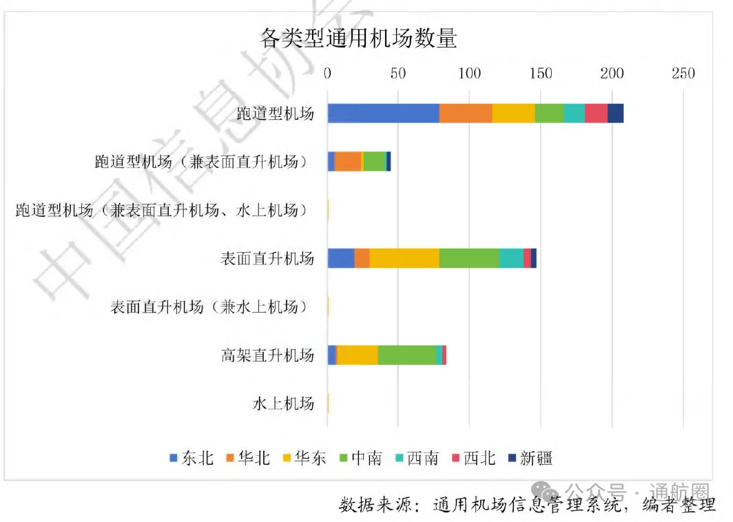 从通用机场类型来看,跑道型机场208个,跑道型机场(兼表面直升机场)45个,跑道型机场(兼表面直升机场、水上机场)1个,表面直升机场147个,表面直升机场(兼水上机场)1个高架直升机场84个,水上机场1个。