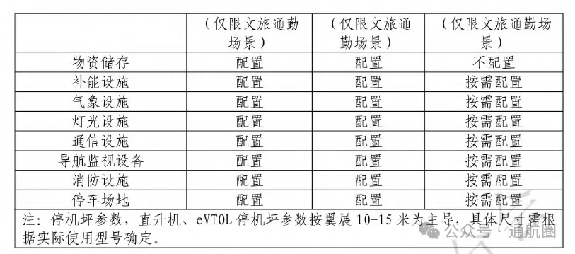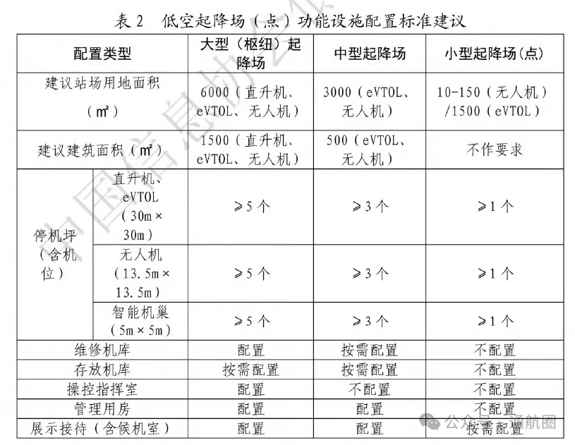 报告对于低空起降场(点)功能设施配置标准给出了建议: