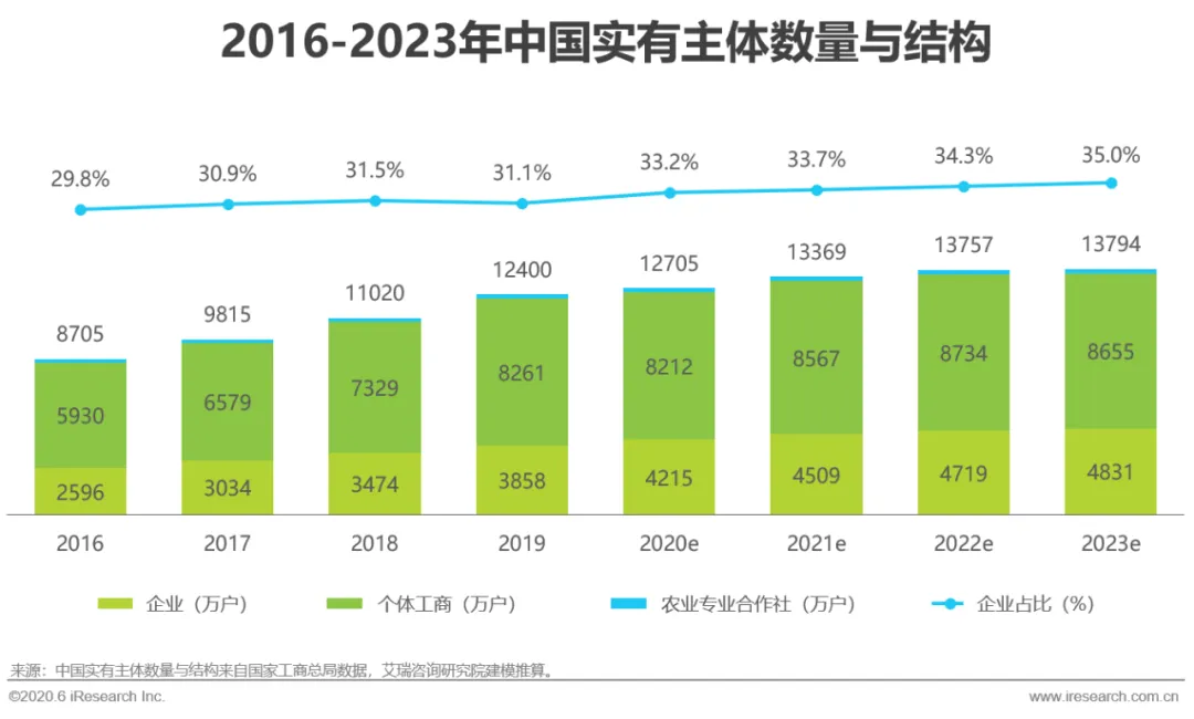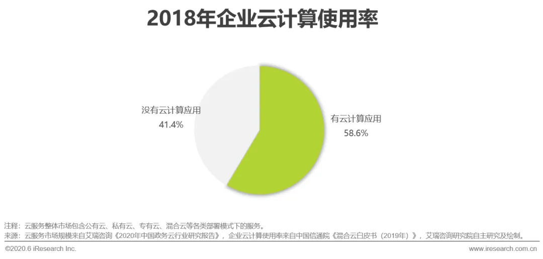 我国企业主体数量不断增加,企业办公市场的基本盘不断扩大。工商总局数据显示,2019年中国实有主体数量达1.2亿户,其中企业实有主体数量达3858万户,占比由2016年的不足30%上升至31.1%。艾瑞推测,预计2023年,中国企业实有主体数量将达4831万户,结构占比将继续上升至35.0%。同时,云计算作为企业基础设施升级的关键性技术,近年来的应用取得突破性进展,2018年中国云服务市场规模实现1026.3亿元,增长率高达48.1%,企业云计算使用率已达58.6%。企业级市场不断扩大的基础盘与云计算的快速普及是疫情期间视频会议特别是云视频会议得以爆发的基础。