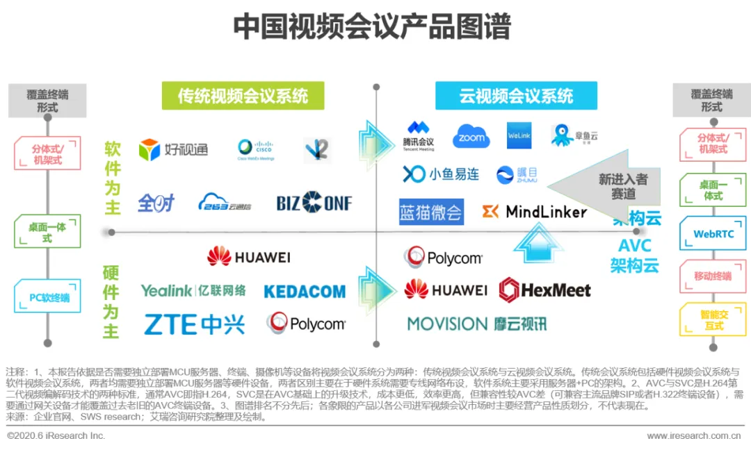 随着云服务发展,大部分客户更偏好部署成本与维护费用低、易拓展、覆盖终端形式更多的云视频会议系统。因此,传统视频会议系统玩家也开始转变路径,将产品云化。其中,硬件视频会议厂商为兼容会议室的存量设备,基本选择以AVC架构的技术路线上云,软件视频会议厂商采用产品性能更好的SVC架构云,一些新进入者也从SVC架构云切入市场。目前,视频会议产品已基本完成云化转型,云视频会议产品在疫情期间的迅速渗透也推动未来视频会议产品向轻型易配置的方向发展。