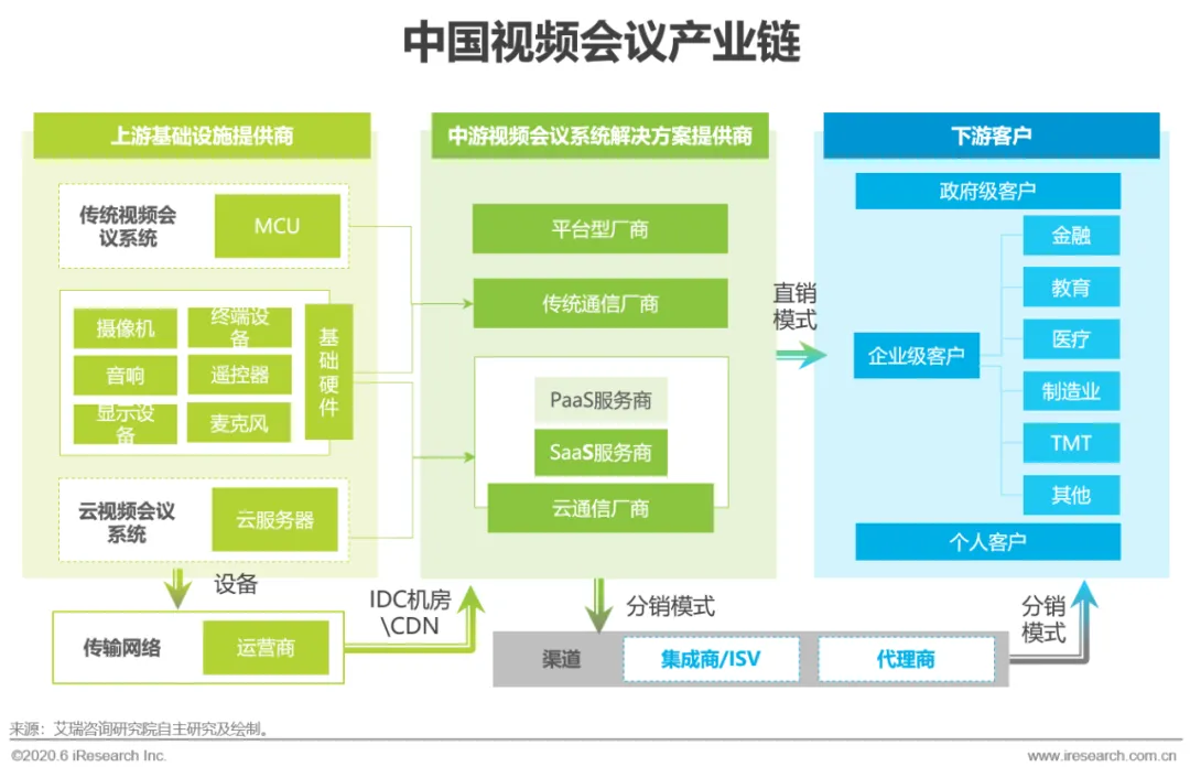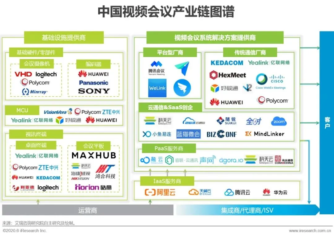 产业链上游为基础设施提供商,包括基础硬件设备厂商、提供网络传输的运营商、面向传统视频会议系统的MCU设备厂商与面向云视频会议系统的IaaS云服务器厂商。
