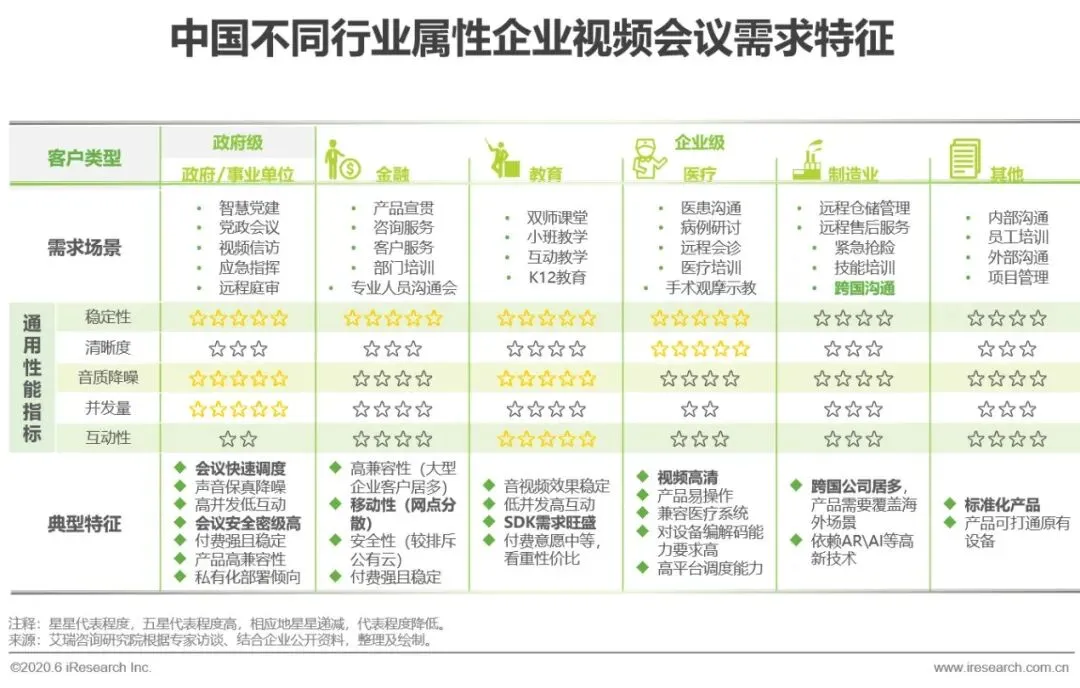 视频会议最终使用者主要为政府客户与金融、教育、医疗、制造业等行业客户。这些客户或为下属分支机构多,或为下游业务空间分布广,在通用功能上,行业间无大差异,满足通用指标即可。但落到各行业细分场景上,定制化需求特征十分明显:教育行业客户主要面向大量学生群体,偏好门槛较低的SaaS类产品;医疗行业客户对视频高清以及制造业企业对产品覆盖海外场景提出诉求;其余行业客户均有较完备的存量IT基础设施,对新会议系统有兼容性、安全性与稳定性要求。