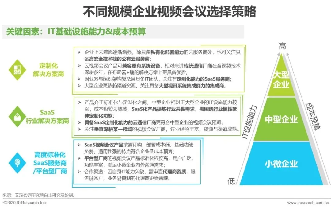 不同规模的企业选择视频会议系统主要取决于IT基础设施能力与付费能力两大因素。大型企业营收能力与付费意愿强,通常有成熟的IT开发系统,需要稳定安全的且可兼容原有系统的视频会议系统;大型企业业务与组织结构复杂,同时也需要服务商具有定制化与完善的后续服务能力。
