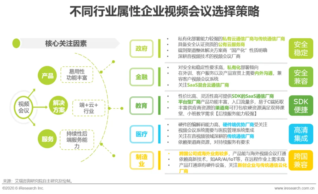 各行业要依据场景需求做产品甄选,主要关注三点,一是产品功能性,二是解决方案能力是否覆盖云、端、垂直行业,三是服务可持续性。传统通信厂商一般有多年的硬件设备研发能力,专业的音视频编解码技术与多年的落地经验,适用于一些对终端要求比较高,对渠道资源与后续服务比较依赖的行业,比如重私有化部署的政府与金融,重视频高清与稳定的医疗行业;平台型厂商与SaaS厂商的产品功能丰富,其低门槛的使用体验便于C端用户规模的快速扩张,适用于重产品丰富性与二次开发便捷的教育行业;一些在海外布局网络节点的SaaS创企可以更针对性地为跨国性制造业企业提供服务。