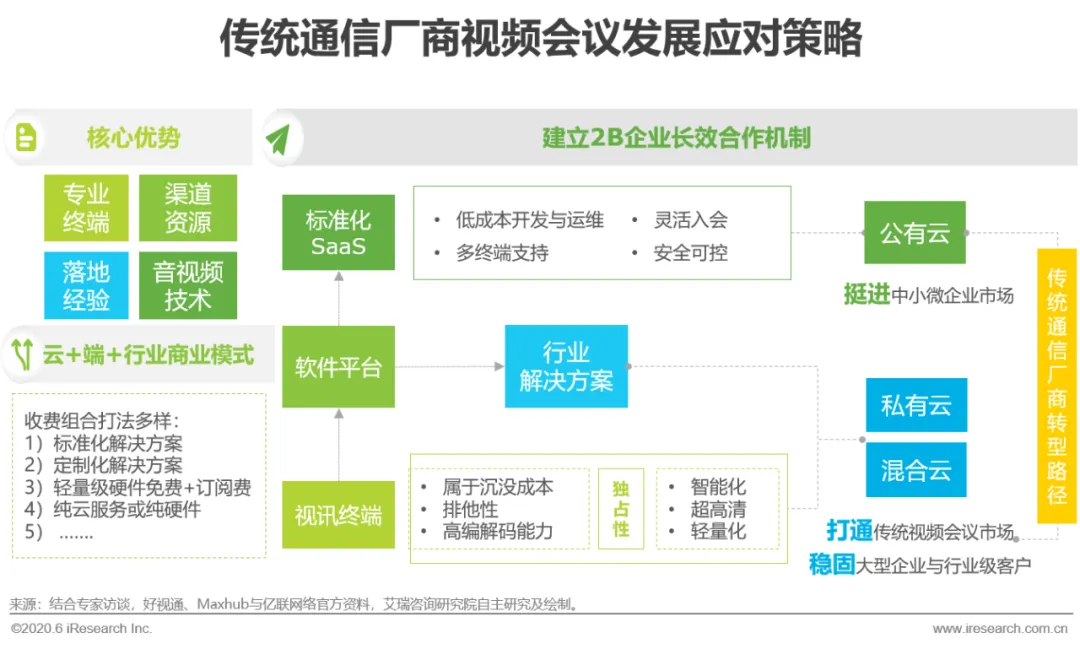传统通信厂商一般深耕音视频技术多年,在硬件终端集成,私有化部署,行业落地经验上极具优势。近年来,随着云通信技术的发展,企业除继续完善终端设备外,均开拓了云端会议产品,可谓通过云+端+行业方案来固化自身优势。实际上,传统会议室的系统产品具有很强的独占性,一般由政府、金融等大型企业通过私有化方式部署,因基础设施成本高昂,这些终端一旦被部署,不会轻易更换掉。即使在今日,云视频会议系统虽然解决了传统会议二次开发、高成本运维、难以灵活扩容等问题,但仍无法改变专业硬件终端极强视频解码能力的冲击与“一旦使用难以替代”的事实。传统通信厂商可借助视讯终端的独占性建立2B企业的长效合作机制:以硬件为基础,建立软件平台,以私有云或混合云部署方式为大型企业与强需求行业提供定制化解决方案。当然,传统通信厂商除了深耕固有市场之外,仍然要通过不断强化自身优势,延伸至公有云视频会议市场:通过提供部署灵活、安全密级高、多设备支持的标准化SaaS视频会议产品挺进中小型企业市场。