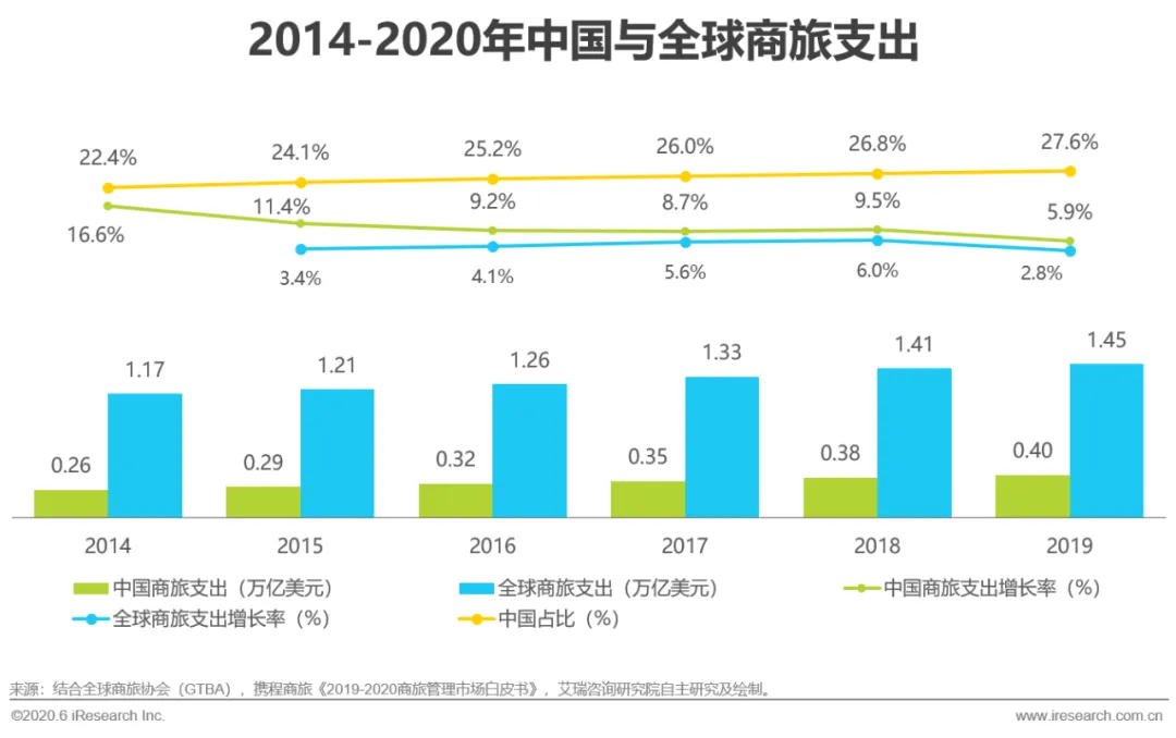 视频会议发挥着商旅的替代作用,疫情加速视频会议渗透的同时冲击着商旅市场。然数据显示,中国企业商旅支出不断扩大,由2014年的2600亿美元上升至2019年的4000亿美元,年复合增长率达10.2%,在全球商旅支中占比由22.4%上升至27.6%,中国企业商旅成本一路高企。同时,2019年企业差旅支出占比调研数据显示,六成以上中小企业差旅支出占总支出比例超5%,四成大型企业差旅支出占比超10%,差旅成本可控空间仍然很大。考虑到疫情爆发后,大部分企业使用视频会议协作工具进行商务沟通,节省了非必要的商务出差成本,视频会议也有理由成为企业提效节流的重要出口。