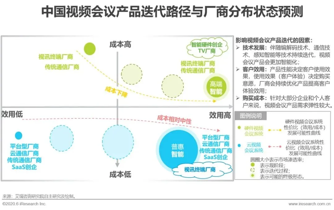 硬件视频会议系统较云视频会议系统稳定性高、画质清晰,客户体验优质,但涉及终端、专网等部署,成本极其高昂。客户是高性价比产品追逐者,硬件视频会议系统厂商未来可能会牺牲价格扩大市场;云视频会议产品价格低廉,以持续获客与客户持续付费回转资金,价格相对中性,厂商主要靠提效提高产品渗透。在共性上,两种视频会议系统都会随视频会议技术发展趋向智能化。在产品迭代过程中,一些新的玩家可能会进入市场,如智能硬件企业或TV厂商可能切进硬件视频会议系统市场,视讯终端厂商可能不止于提供端,将会部署云会议系统(如华为),艾瑞预测,未来视频会议市场将会由多种形态玩家共同耕耘。