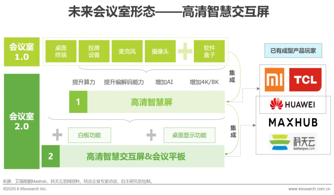 疫情加速了云会议系统的渗透,但走出疫情至线下办公场景,移动化属性较强的SaaS视频会议系统仍然无法替代刚需的商务室内会议场景。各视频会议厂商除在流量留存与变现上思考以外,仍会将视线聚焦于如何变革传统会议室。艾瑞认为,传统会议室的变革基础逻辑即为升级硬件,在硬件基础上升级软件系统。如果把目前形成的“盒子+配件”称作会议室1.0模式,未来,硬件终端的迭代将会衍化出两种会议室2.0模式: