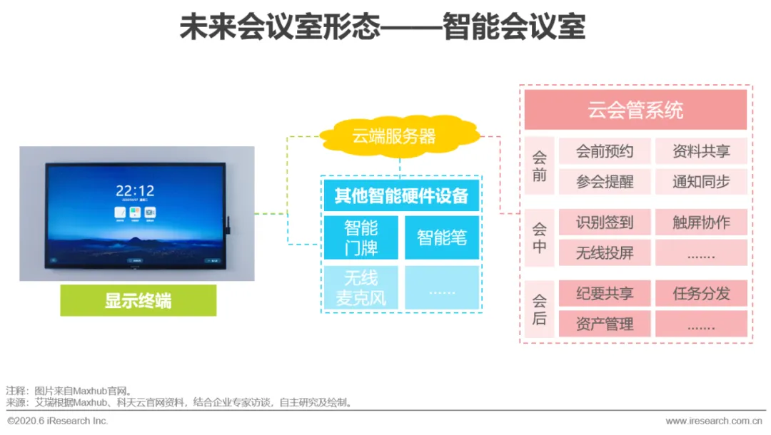 除了显示终端的升级,智能会议室仍然需要其他智能硬件与系统协助,如智能显示门牌,智能手写笔、无线麦克风等硬件终端与全会议流程管理的可视化云会管系统打通。未来会有更多的一体化智能会议解决方案商融入视频会议生态链,他们将重新定义会议室形态,依靠云平台升级与融合各类硬件设备,实现会议简单组织、实时发起、便捷协作和有效执行。