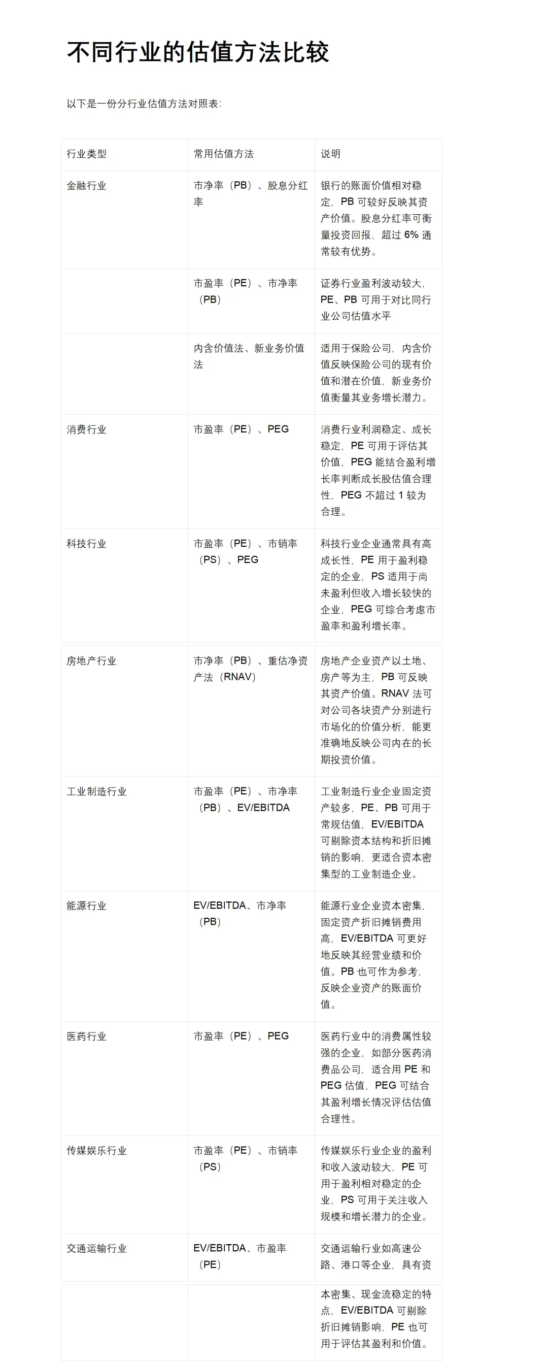 结合行业特性:互联网行业看用户数、LTV/CAC;制造业看 PB、重置成本;消费行业看 PE、PS;金融行业看 PB。