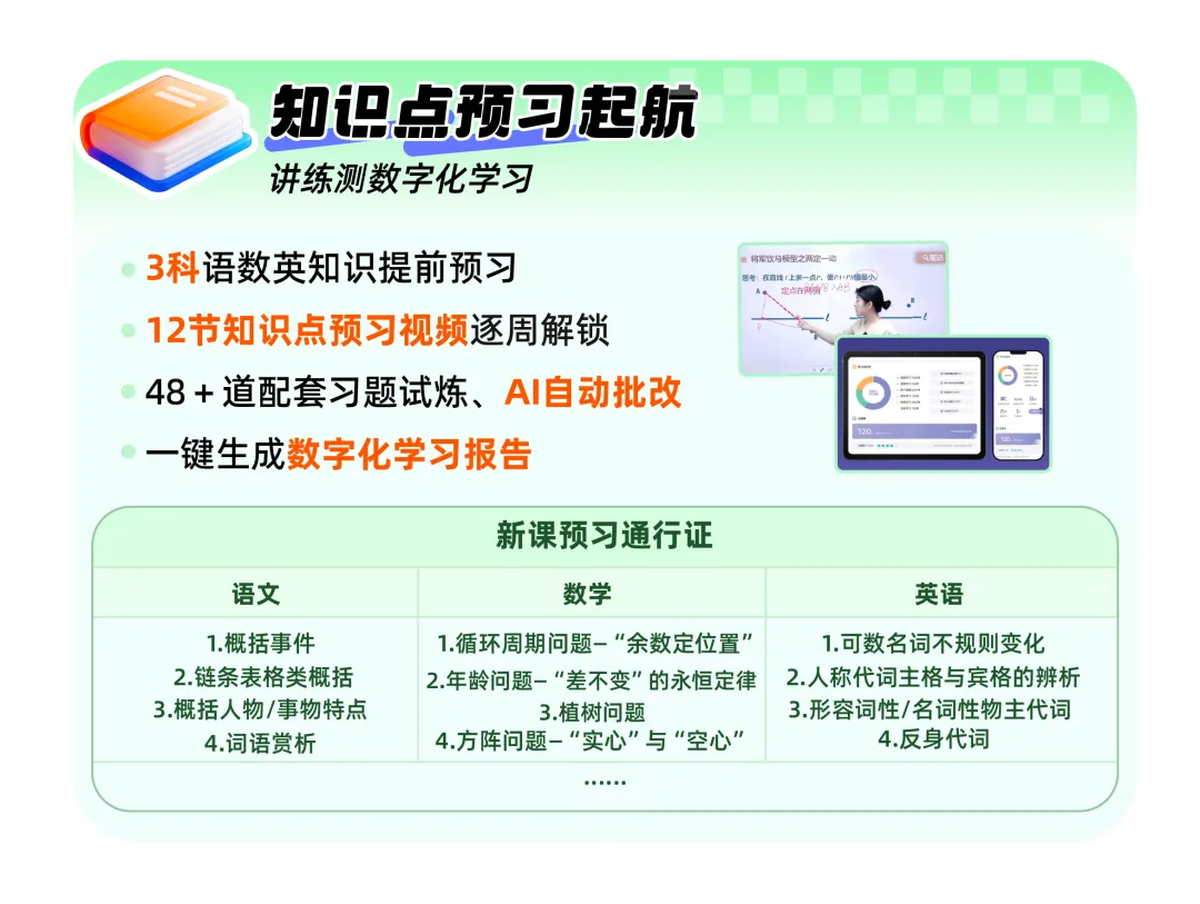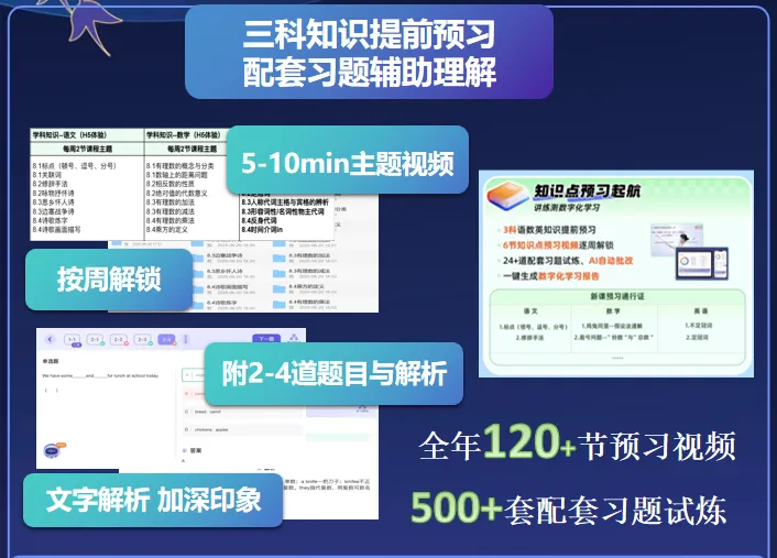 新东方准备了120+节核心预习视频,语、数、英三科全覆盖。关键不在于“抢跑”,而在于紧跟校内进度,逐月解锁。