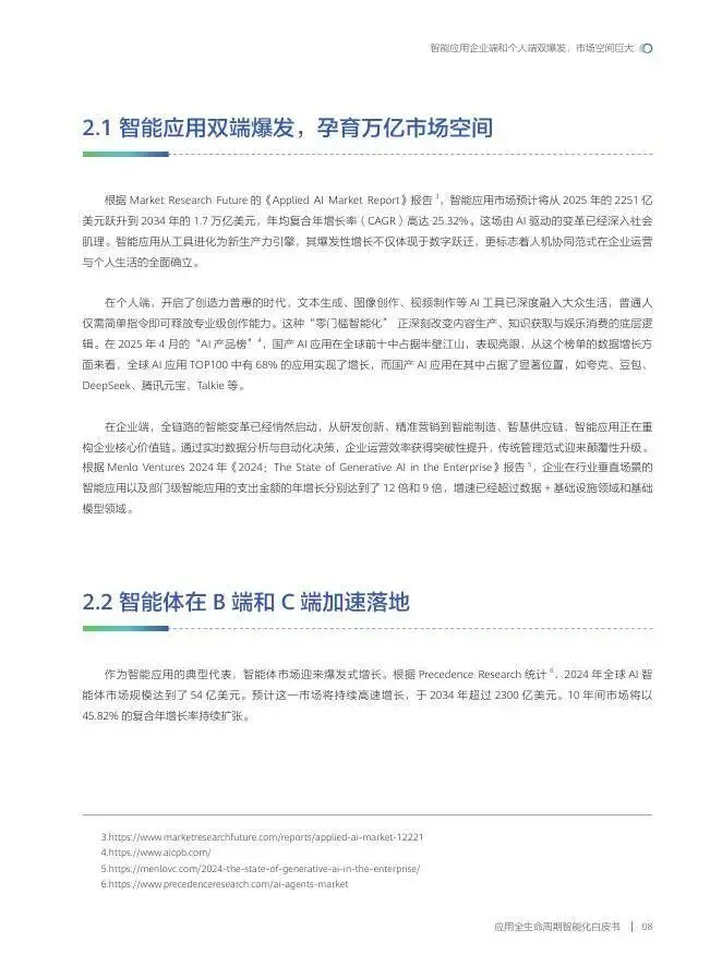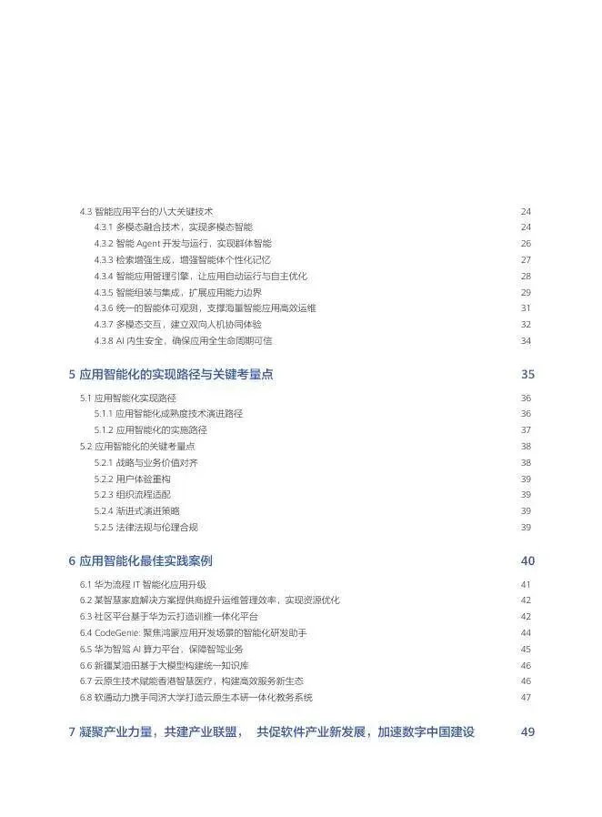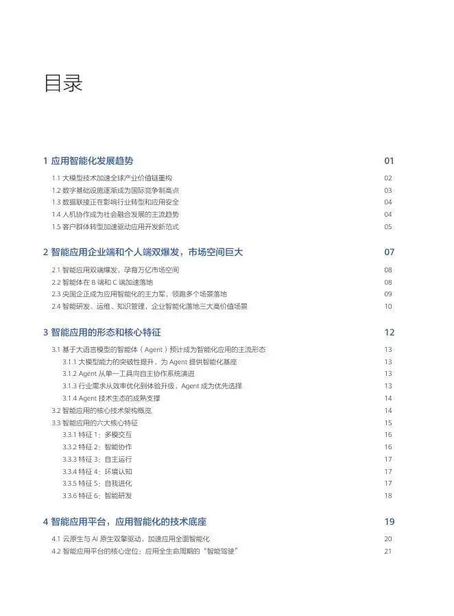 当前,以大模型和智能体为代表的人工智能技术正驱动新一轮产业变革,推动应用架构从功能自动化向认知智能化 跃迁。本白皮书系统阐述应用智能化的框架、关键技术、和实现路径,旨在帮助企业应对应用智能化三大核心挑战: