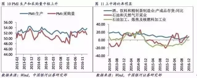 由于2016年下半年需求相对平稳并且PPI持续上涨对库存投资的拉动,2016年7月开始补库存周期。截至2016年底,工业企业产成品库存同比持续回升至3.2%,PMI生产指数与采购量指数的运行中枢上移,企业生产经营活动开始改善。