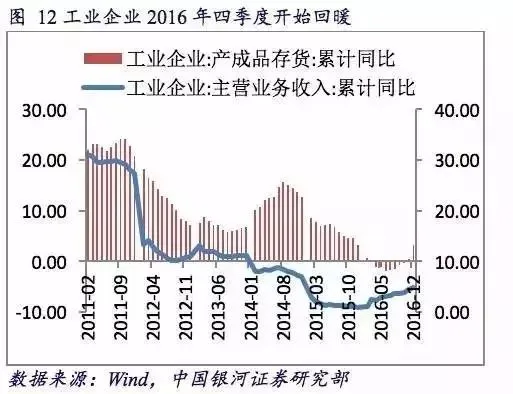 本轮库存周期从2011至2016年6月份为持续去库存阶段,“去库存”超额完成任务后,生产及流通环节的库存已至低点。自2011年起PPI经历了54个月的负增长后于2016年开始修复,并于2016年9月由负转正。
