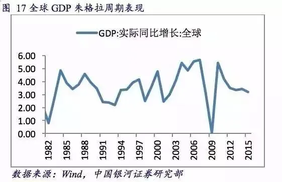 1975年以来,全球经济大约经历了五轮朱格拉周期(1975-1982,1983-1992,1993-2000,2001-2008,2009-)。中国也经历了4轮朱格拉周期(1981-1990、1990-1997、1997-2008、2008至今)。