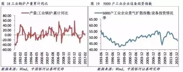 关于中国经济的朱格拉周期,工业锅炉的产量增速代表微观上制造业资本支出意愿,从此指标可看到在1998-2007、2007-2015两个周期,每个周期8-9年。此外,5000户工业企业设备投资情况(截止至2013年)也呈现出了清晰的周期的特征。
